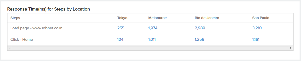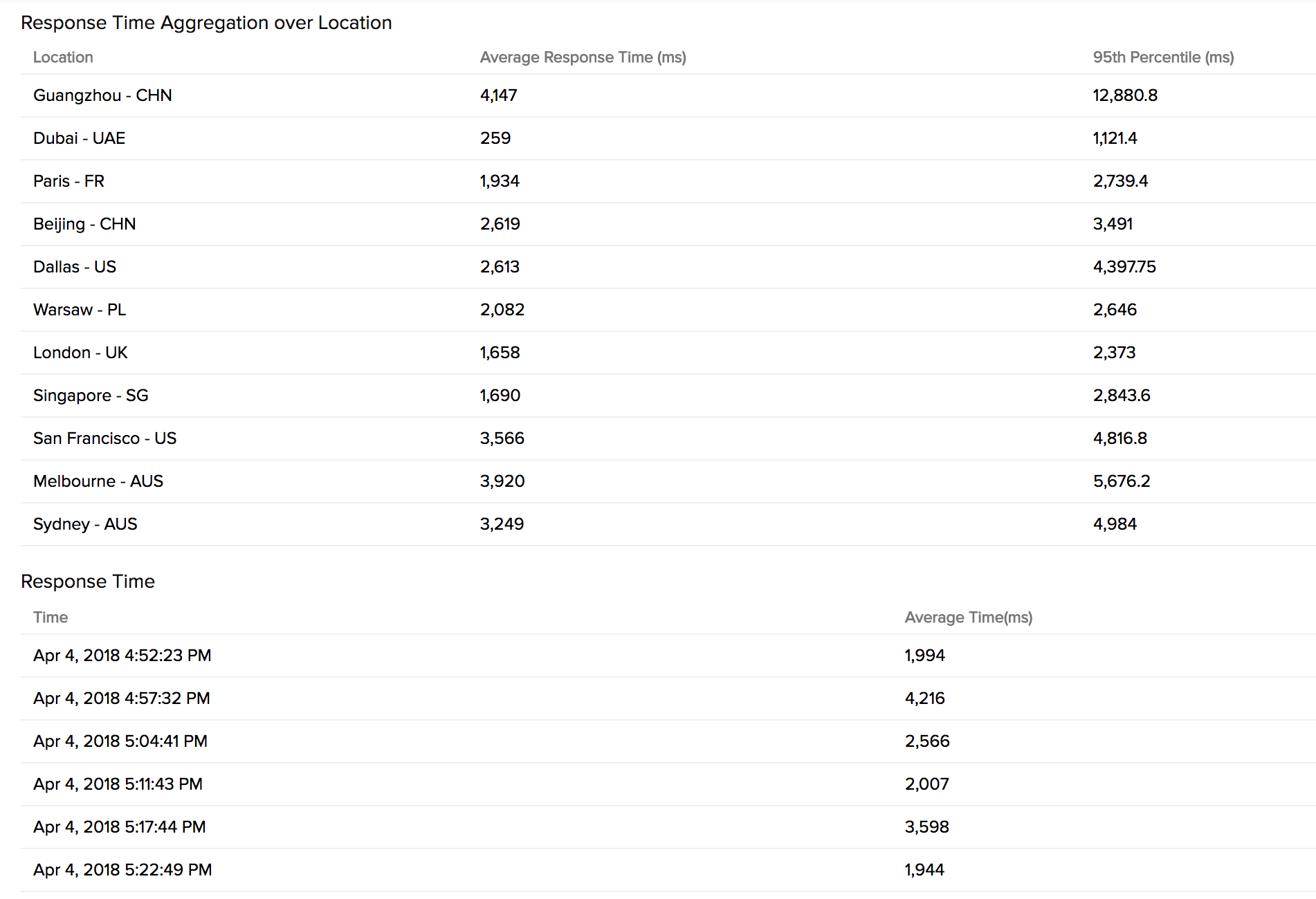 - 响应时间和按位置的响应时间表示检索网页的整个 HTML 内容所花费的基于位置的总时间。平均响应时间和按位置数据的平均响应时间以表格布局显示,以便于同化。