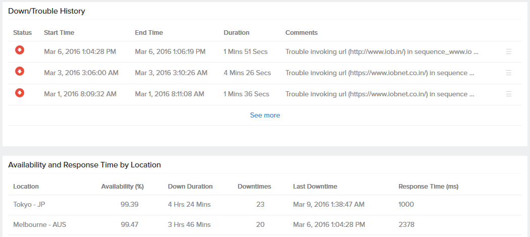 - 按位置划分的可用性和响应时间,以图形和表格形式显示位置的可用性和其他相关指标。