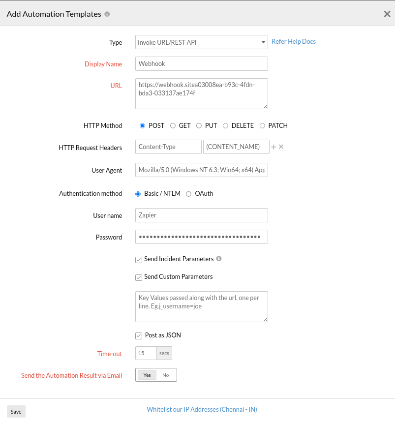Invoke URL/REST API 允许您通过将您的 Site24x7 事件数据与多个第三方应用程序连接来自动化您的 IT 工作流。这是一个“用户定义的 HTTP 回调操作”,通常也称为Webhook。它作为基于事件的输出机制工作。您可以在 Site24x7 中定义特定事件,例如监视器的状态或属性更改。一旦 Site24x7 发生事件或事件,它会将事件数据发布到您指定的 Hook URL。您可以在监视器级别或属性级别映射调用 URL/REST API 操作。您可以进一步传递与中断监视器关联的事件和自定义参数以及 POSTED URL 的正文。