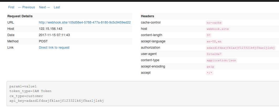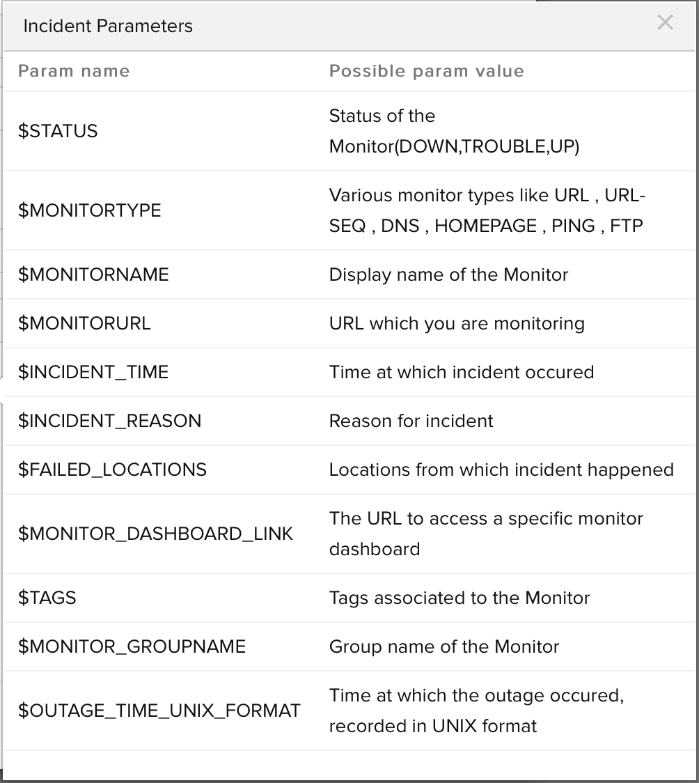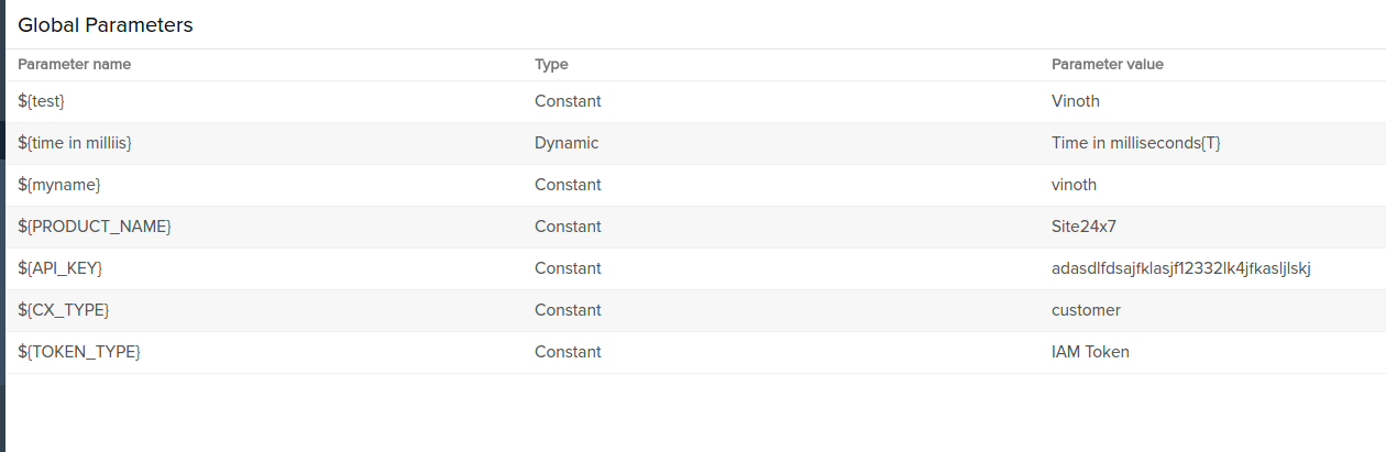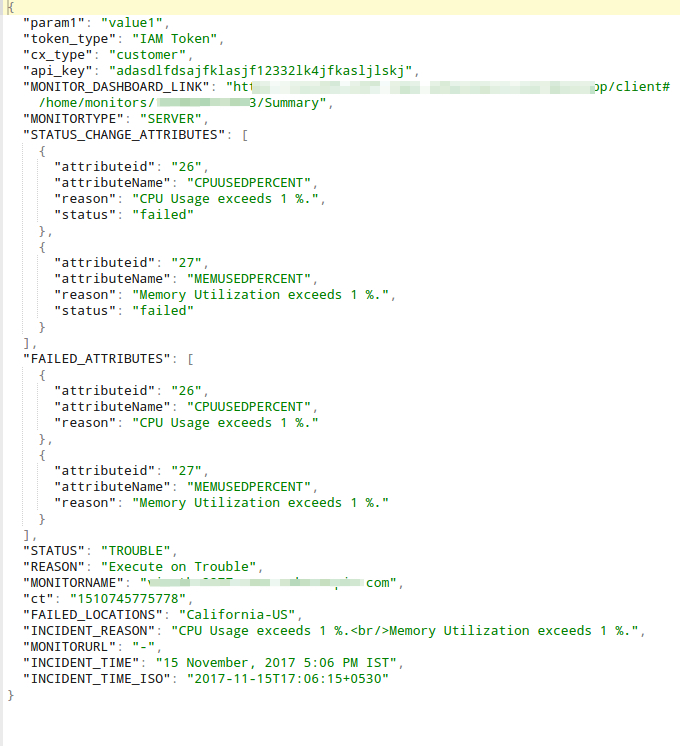 当针对您指定的监视器状态更改或属性更改执行调用 URL/REST API 操作时,还会在 URL 正文中传递以下自定义参数。您可以在下面的屏幕截图底部找到全局参数值已在您的 HTTP 响应中替换为常量或动态值。由于这是一个测试调用,因此没有事件参数与您定义的自定义参数一起传递。