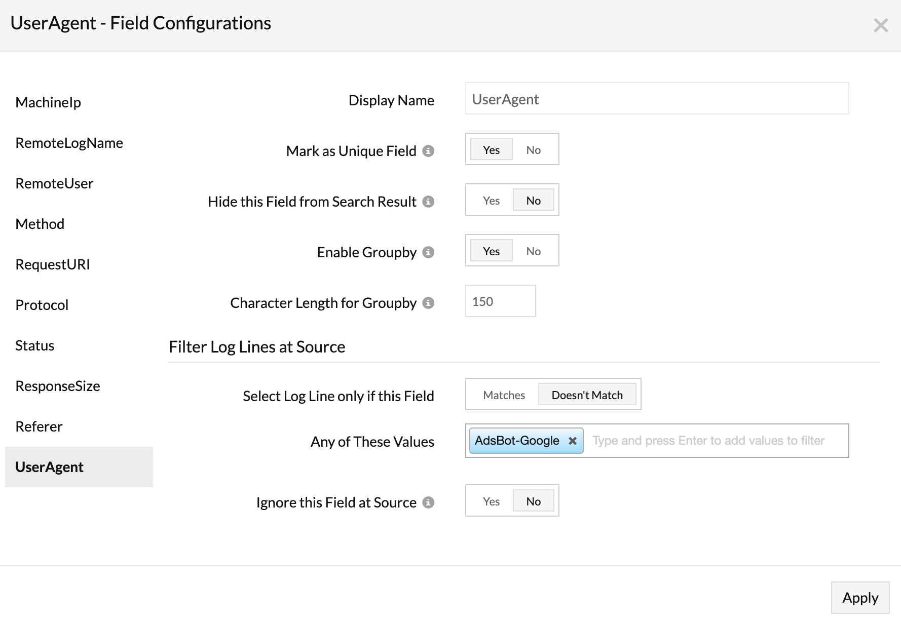如果您在上述步骤中选择了忽略此字段以外的选项,则可以在过滤日志行选项下定义值。您可以将此过滤器应用于上述多个选项。