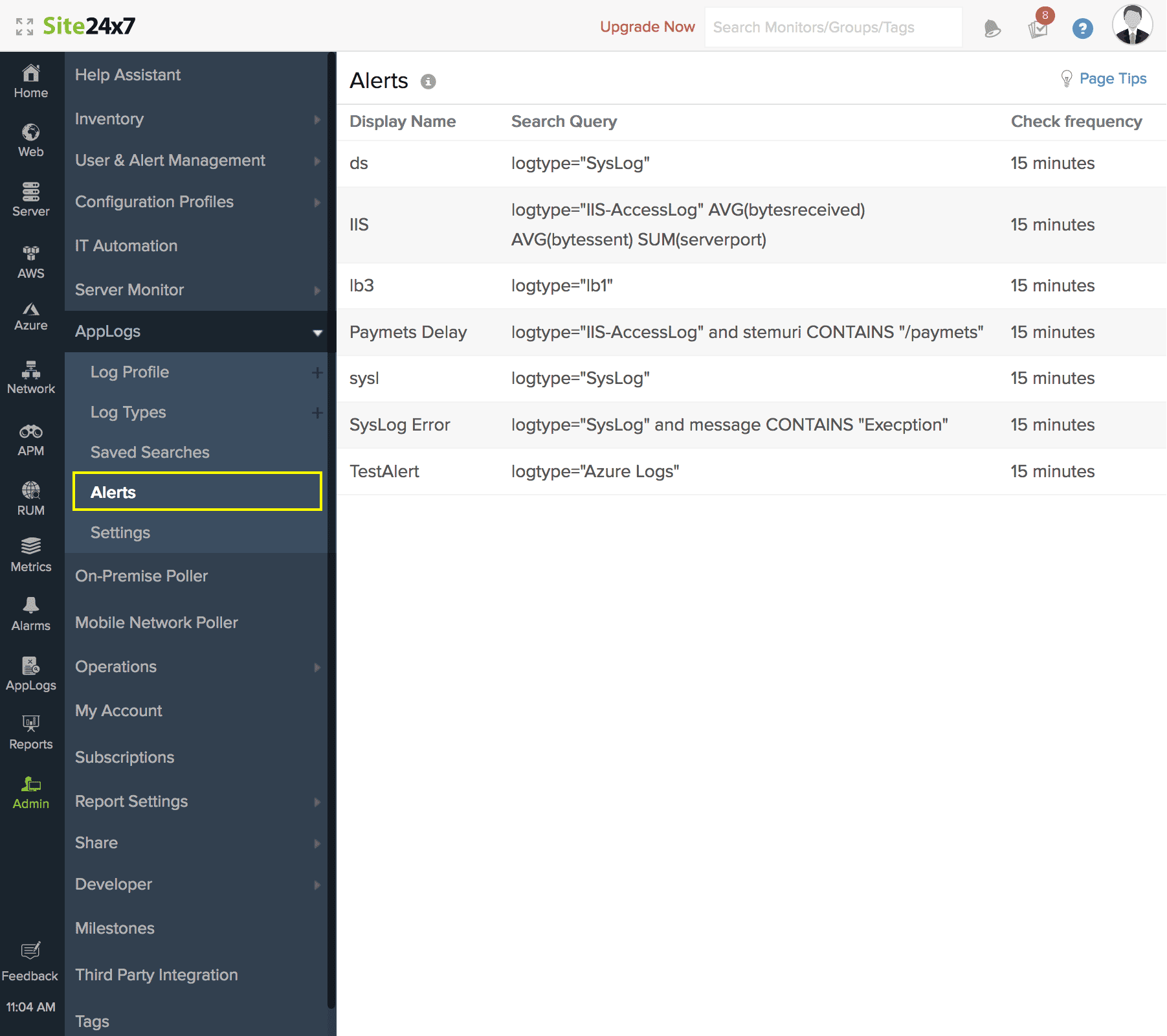 - 转到管理> AppLogs> 告警。此页面列出了您配置的所有告警。