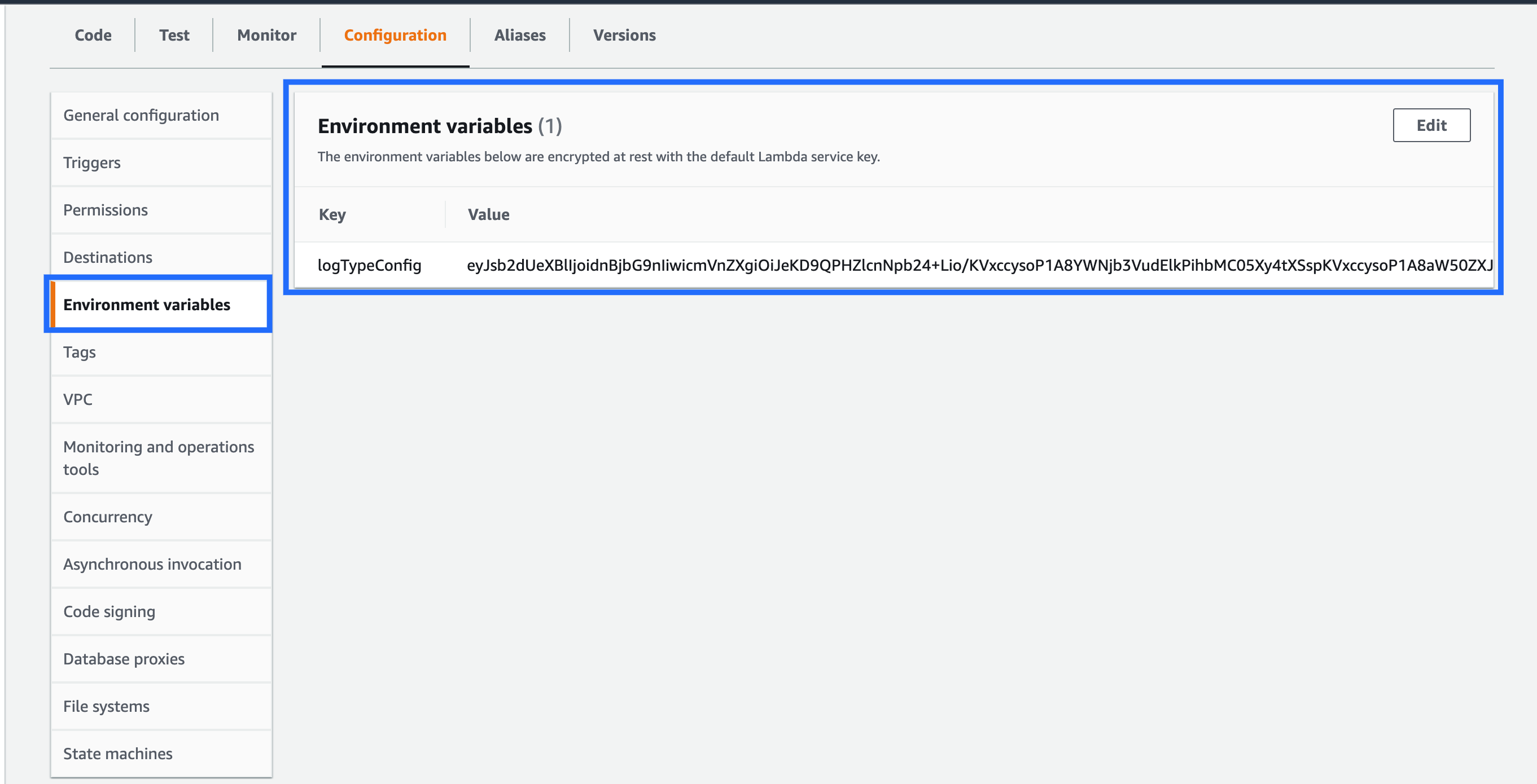 - 将此代码粘贴到 环境变量下, 并在 AWS 控制台中使用字段名称 logTypeConfig 。