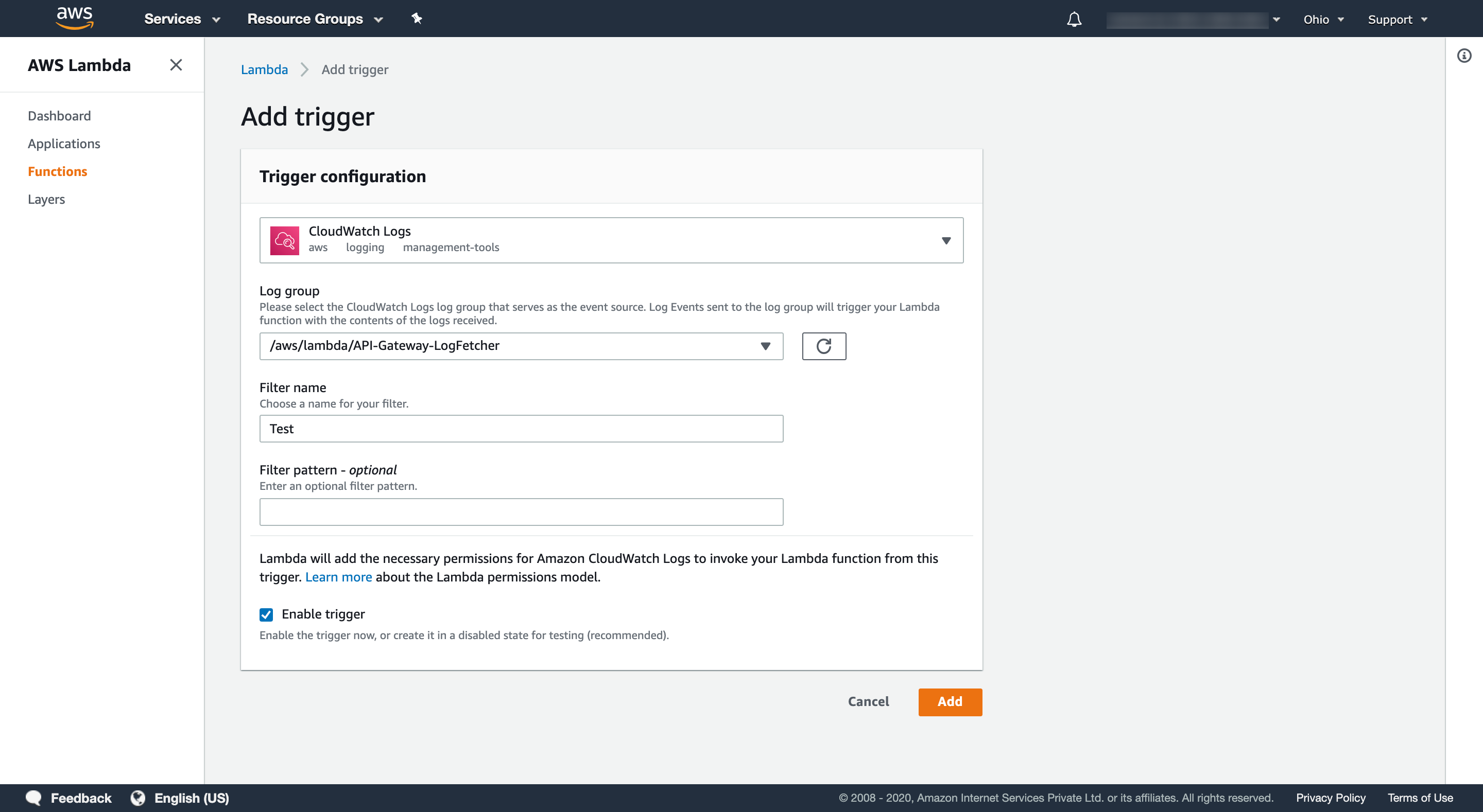 - 从 服务下拉列表中 选择Lambda ,然后选择创建函数。从头开始选择 Author,为函数定义一个名称,然后选择Python 3.7作为Runtime。