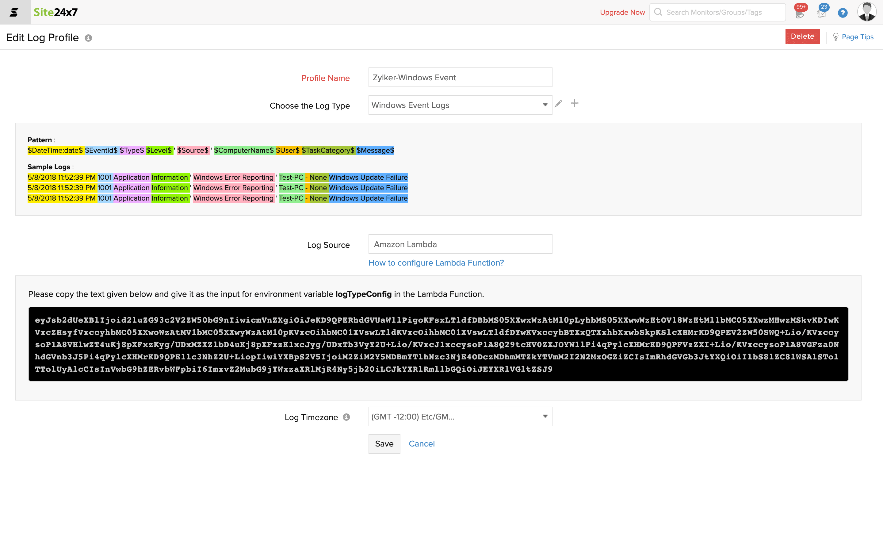 https ://github.com/site24x7/applogs-aws-lambda/blob/master/cloudwatchlogs/cloudwatch-wineventlog-sender.py - 输入代码后,导航到 Site24x7 Web 客户端,选择管理> Applogs> Log Profile,然后选择创建的 Log Profile,并将屏幕上显示的代码复制为 字段 Environment variables 下变量logTypeConfig的输入。
