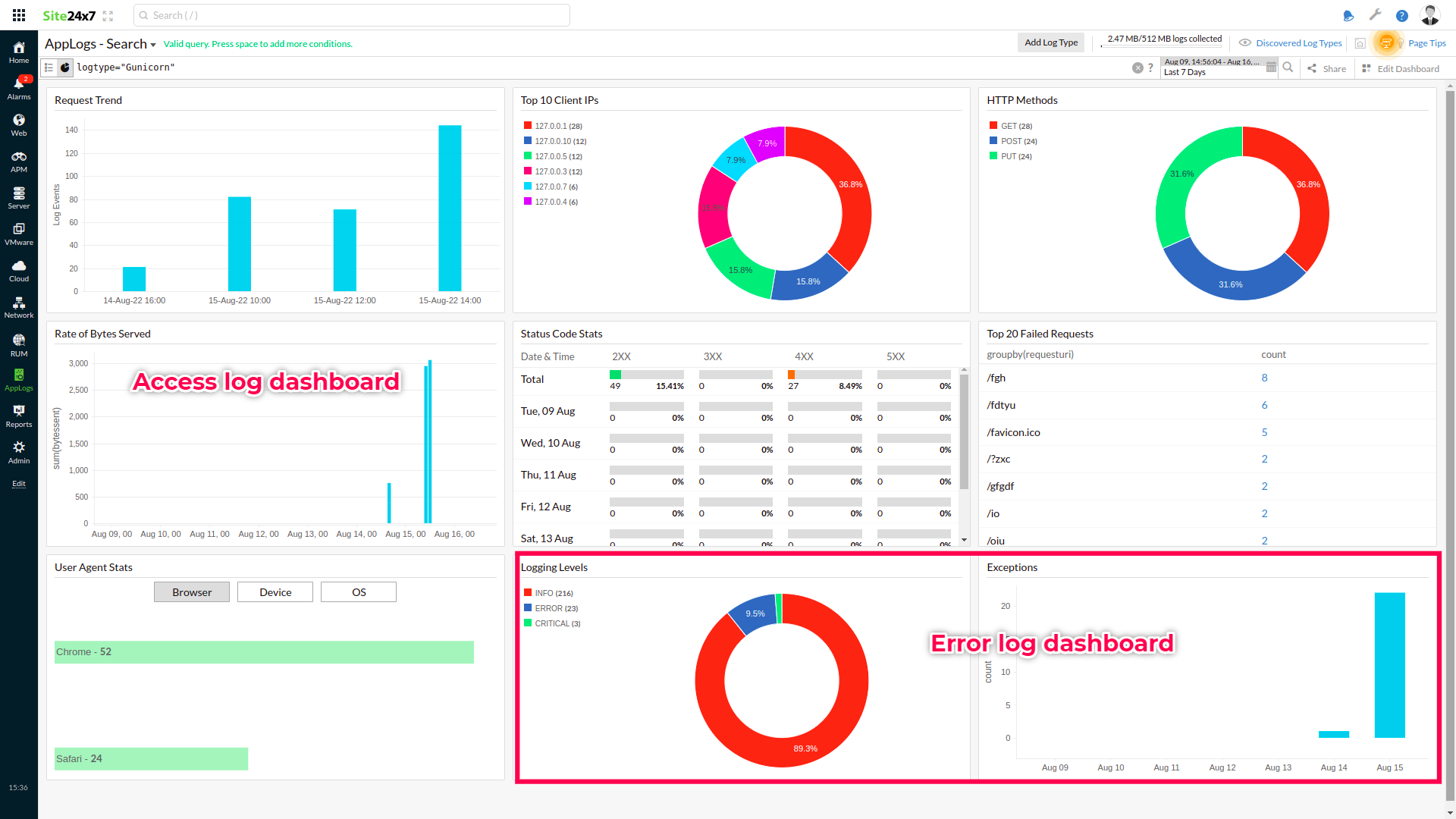 Site24x7's multiple log pattern support enables you to centralize logs written by an application in a different log format and helps you visualize the data on a single dashboard. Learn more about Site24x7 AppLogs.