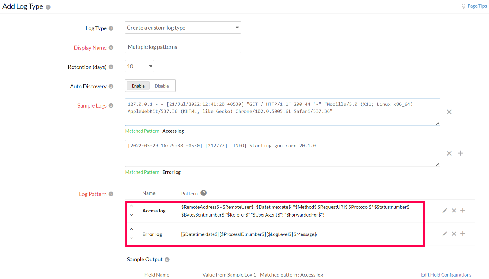 Using multiple log pattern support, you can add different log patterns written in an access.log file and an error.log file under a single log type.