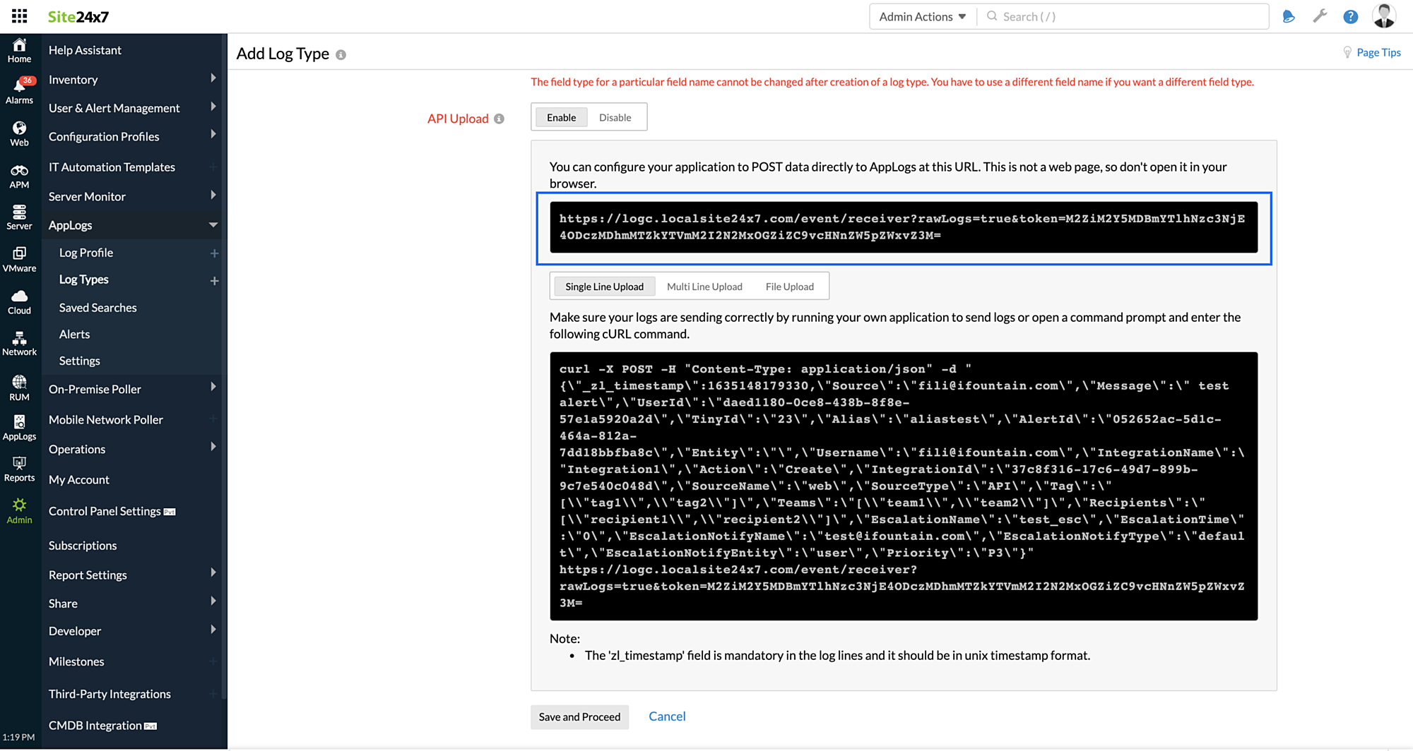- 登录到您的Site24x7 帐户> 管理> AppLogs>添加日志类型。