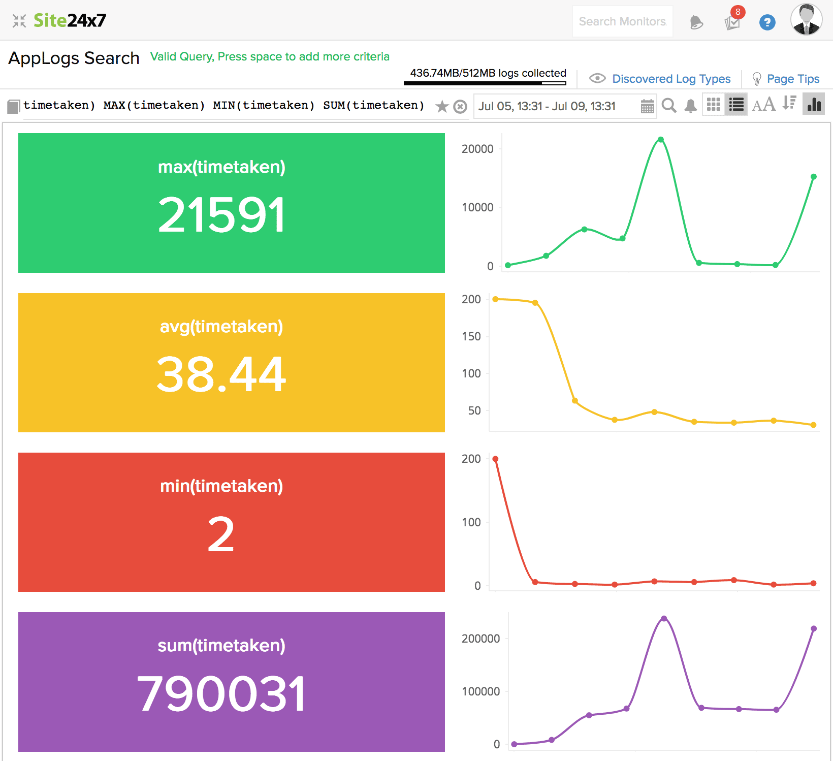 使用它,您可以在日志中找到数字字段的最小值、最大值、平均值和总和。