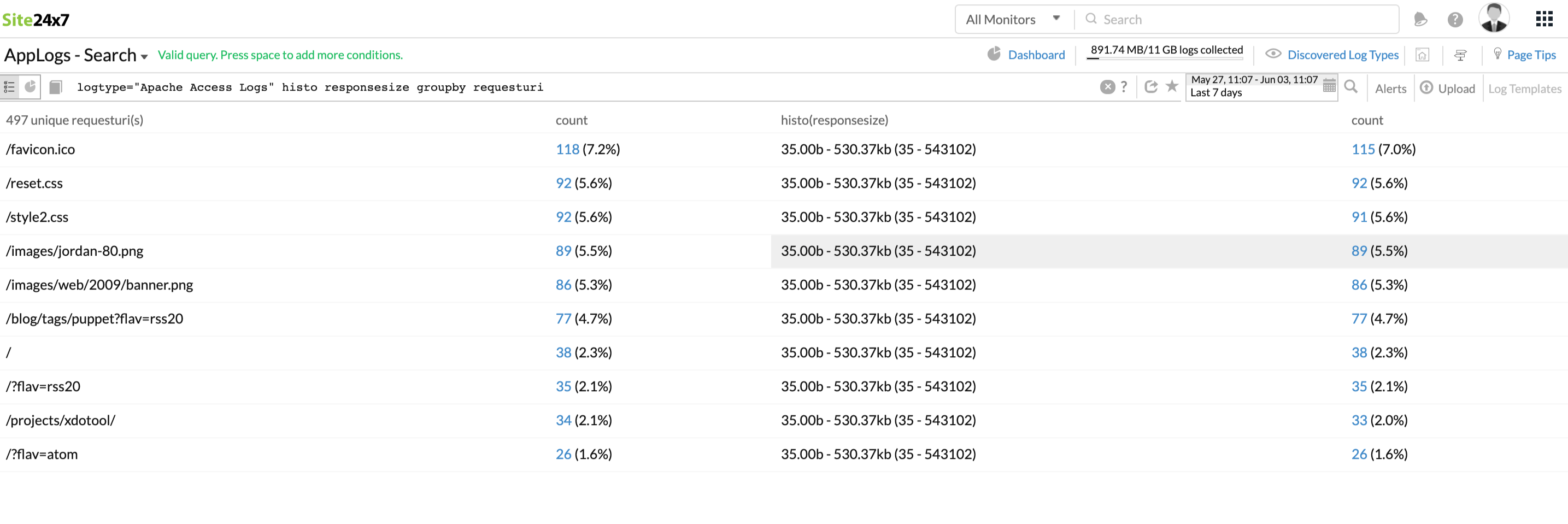 此查询获取按avg(responsesize) 值排序的 requesturi 的输出。