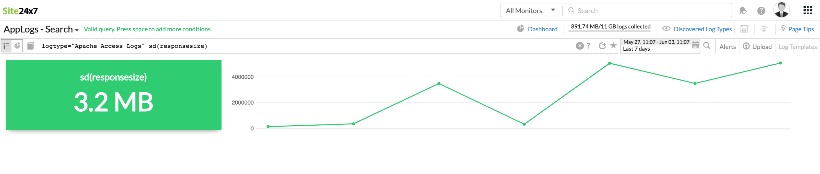返回日志中响应大小的 sd 值。