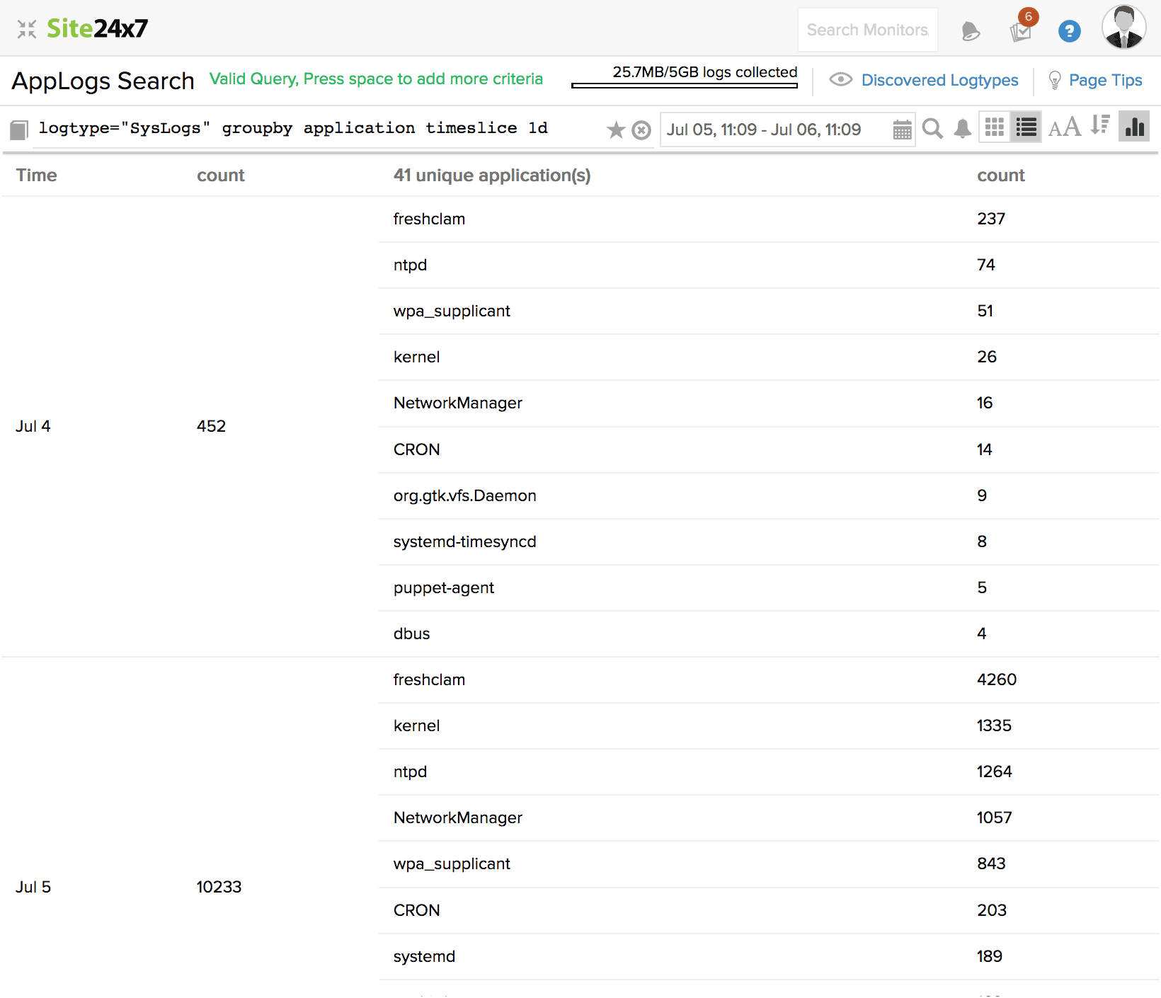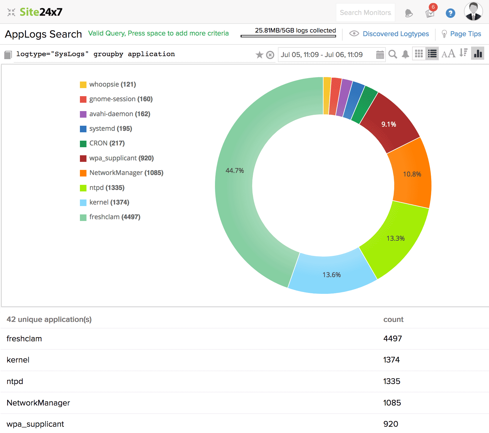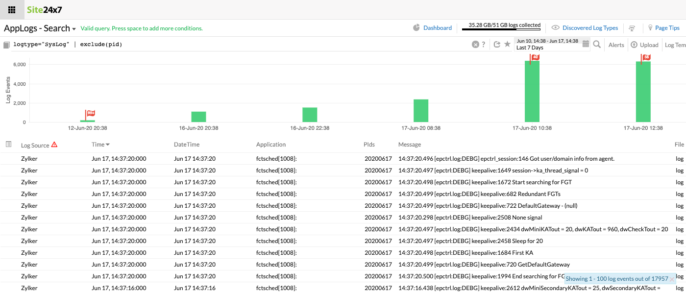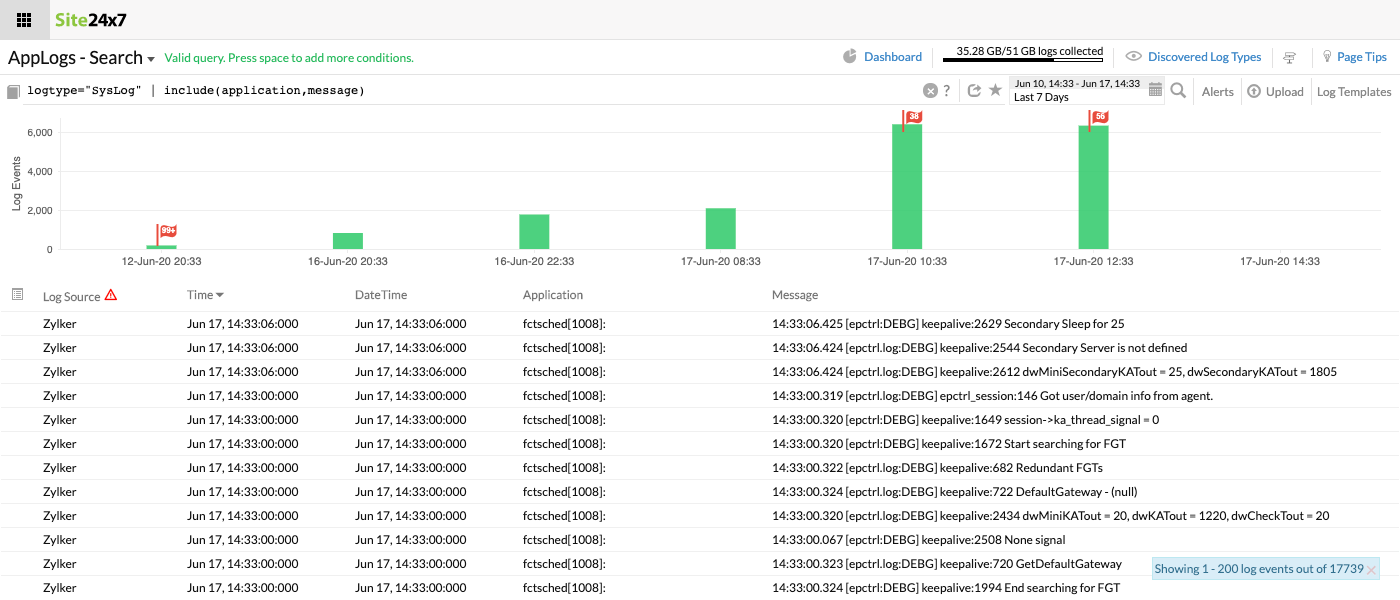 在此查询中,监视器名称和应用程序字段值都将用于搜索日志。结果将显示监视器名称为“Zylker-server”的值和包含“kernel”的应用程序。