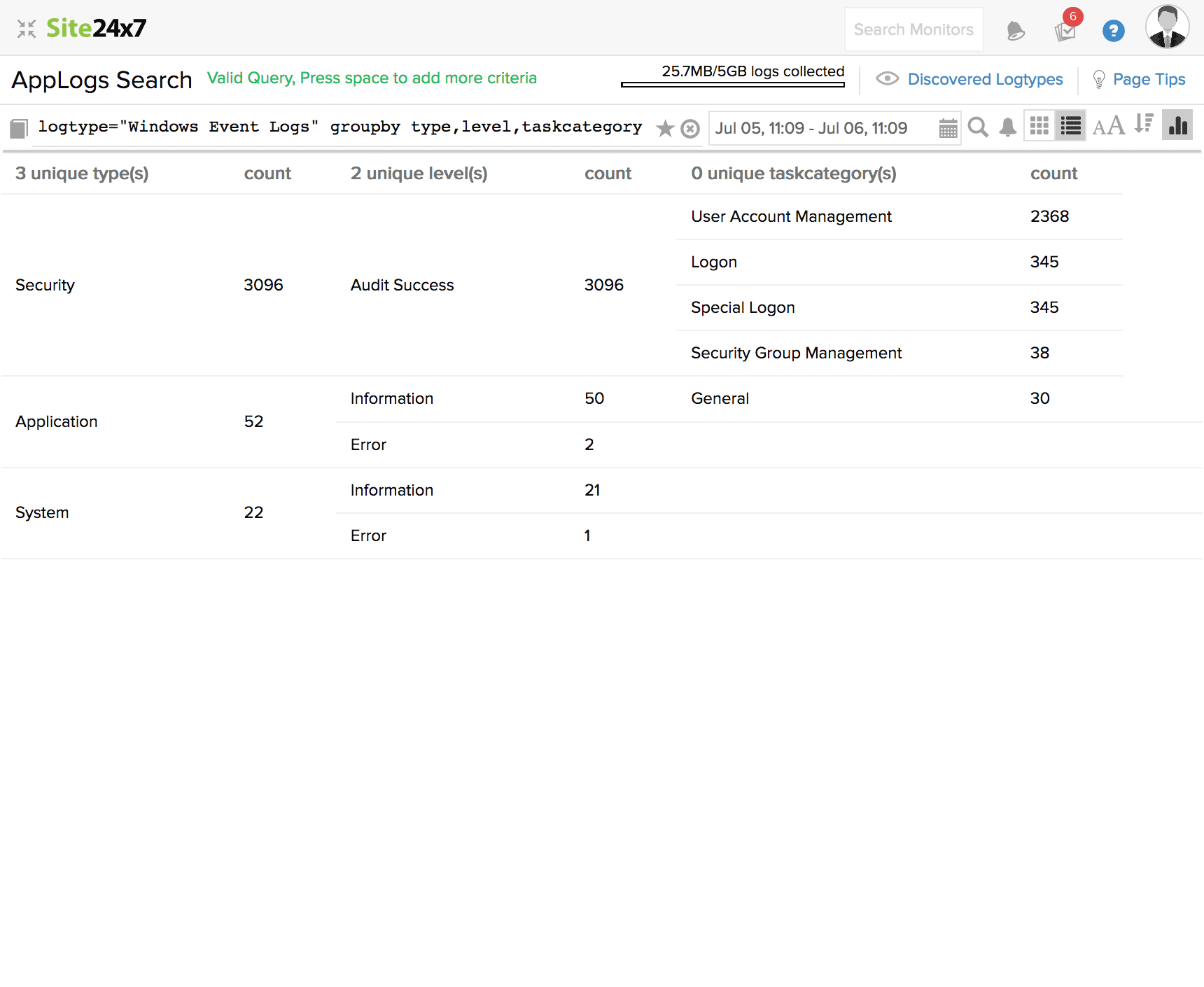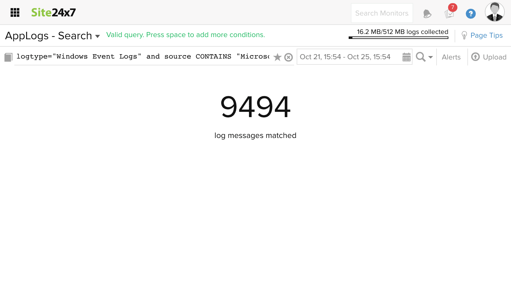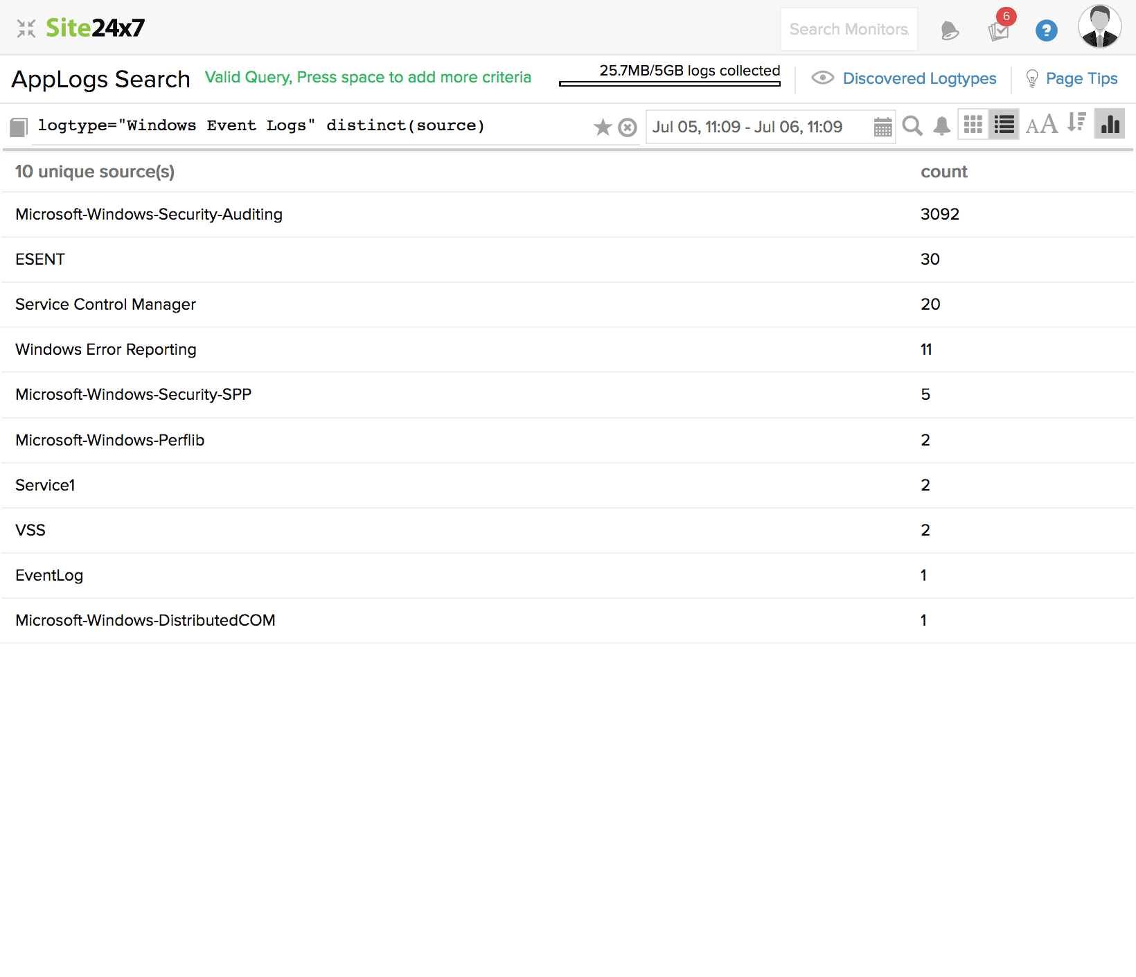 在此查询中,监视器名称和应用程序字段值都将用于搜索日志。结果将显示监视器名称为“Zylker-server”的值和包含“kernel”的应用程序。