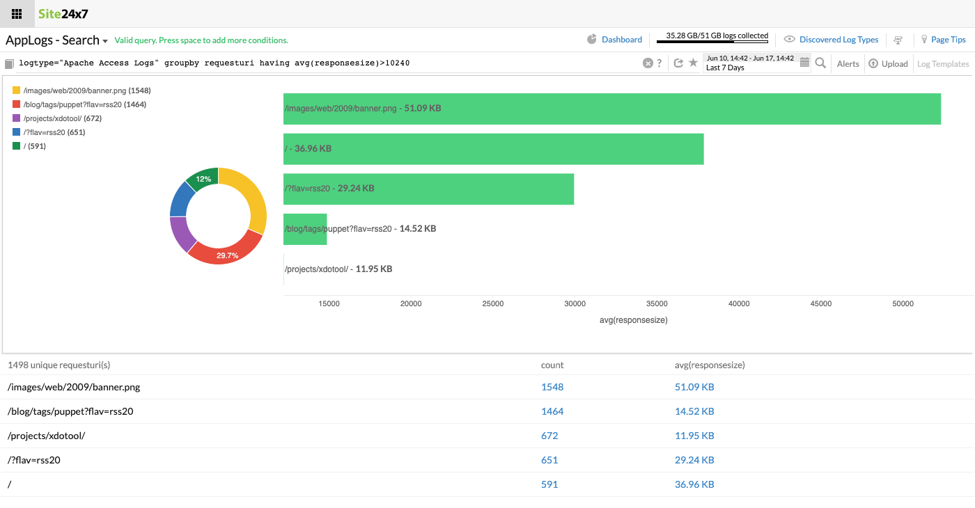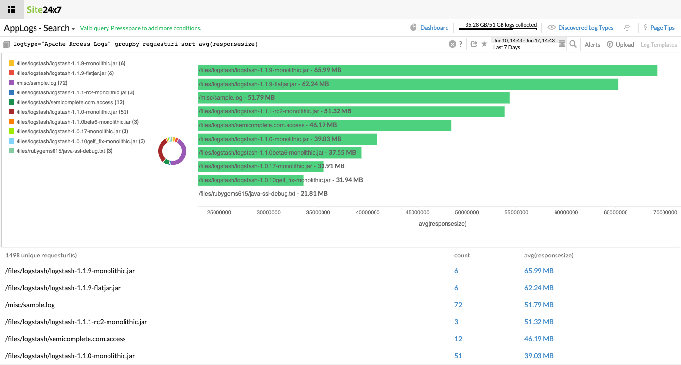 logtype="Apache Access Logs" groupby requesturi sort avg(responsesize)