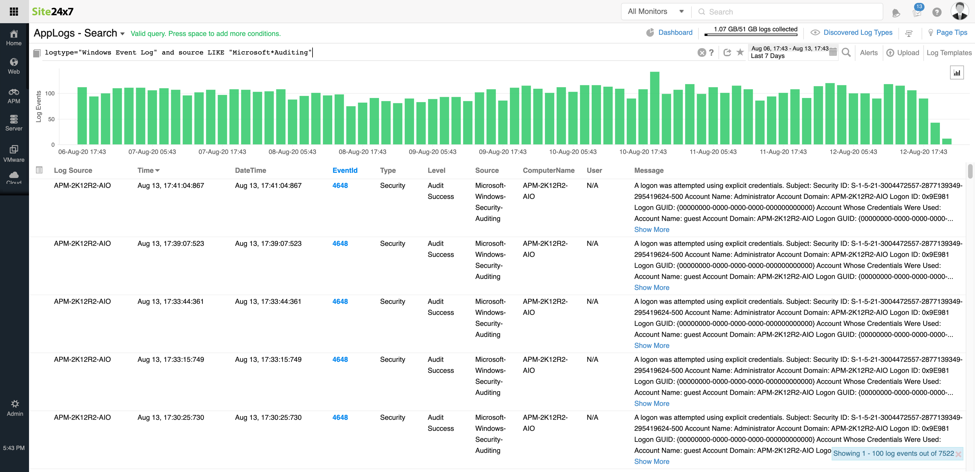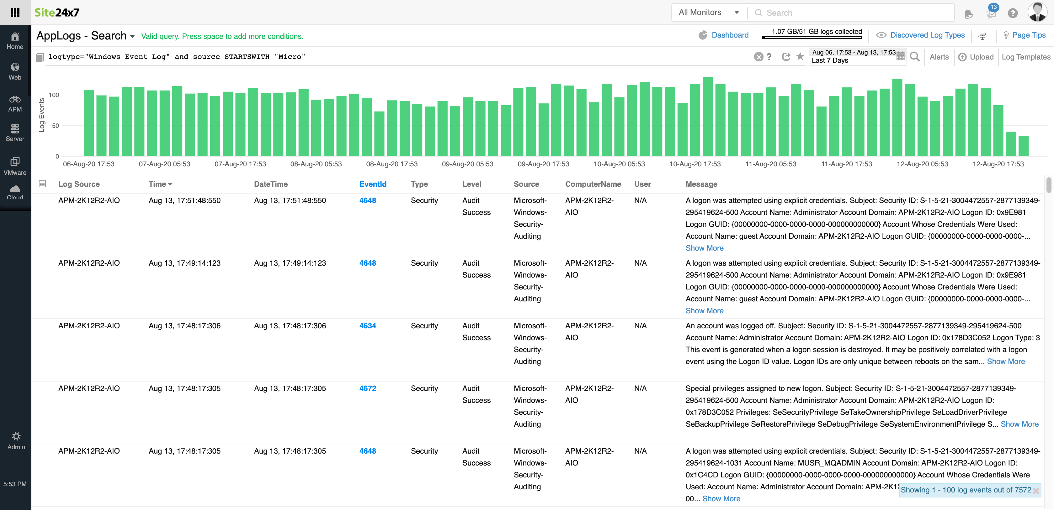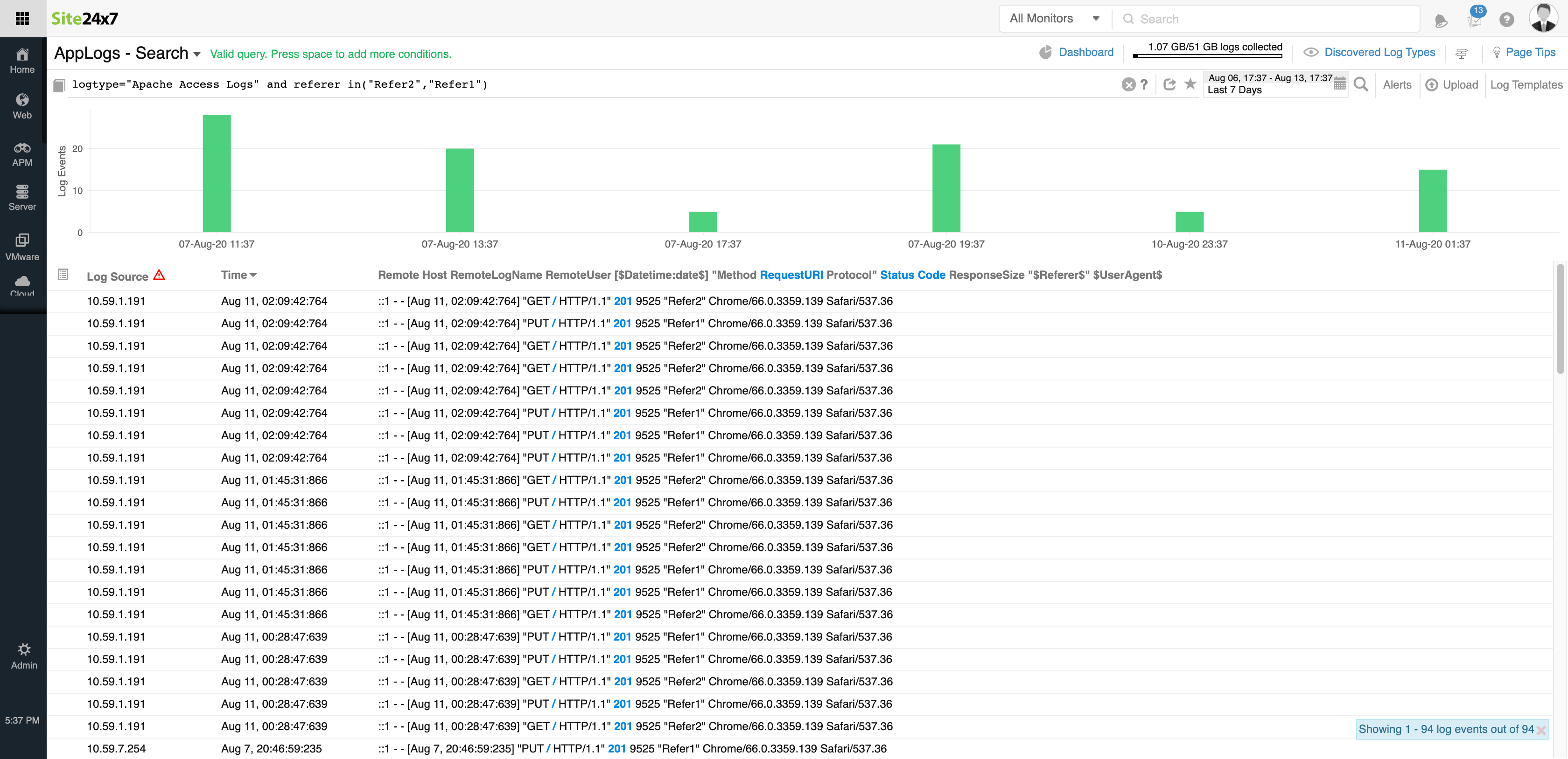 在此查询中,将显示按一天时间分片且在“应用程序”字段中具有相同值的日志条目数。