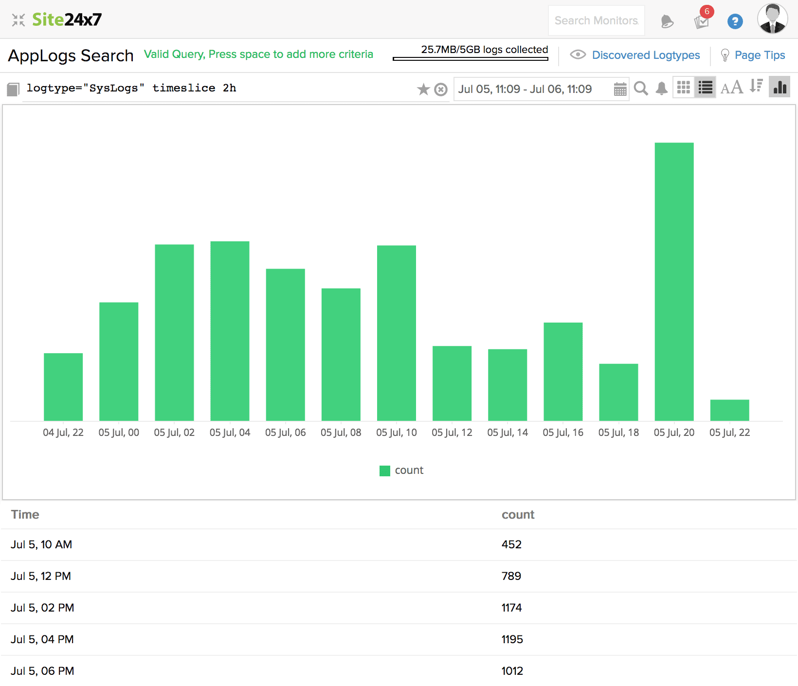 在查询结束时添加 时间片 (时间段)会生成一个表格,其中包含查询的选定总时间段,除以查询中指定的时间片与日志条目计数。可能的时间片值使用单位 d(天)、h(小时)或 m(分钟)。