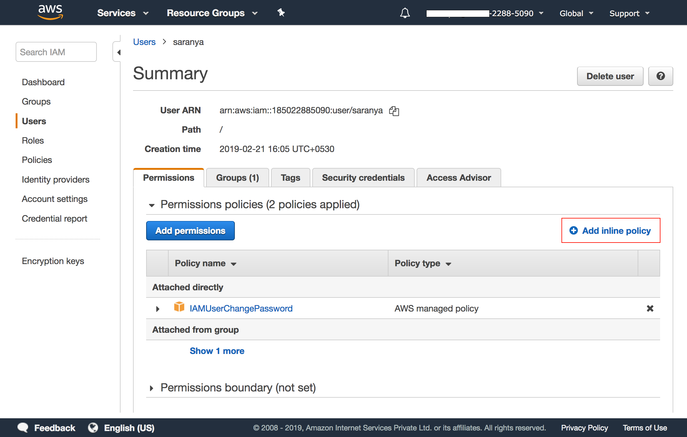 3. 如果您在 Site24x7 中的 AWS 账户配置了用户,则从用户列表中选择用户,在权限选项卡下,单击添加内联策略,然后选择单击此处。如果您已使用角色配置帐户,请选择适当的角色并按照上述步骤中所述的相同步骤进行操作。选择服务及其相应的操作和资源,然后在编辑器窗口中,为您的自定义策略命名并粘贴以下内容: