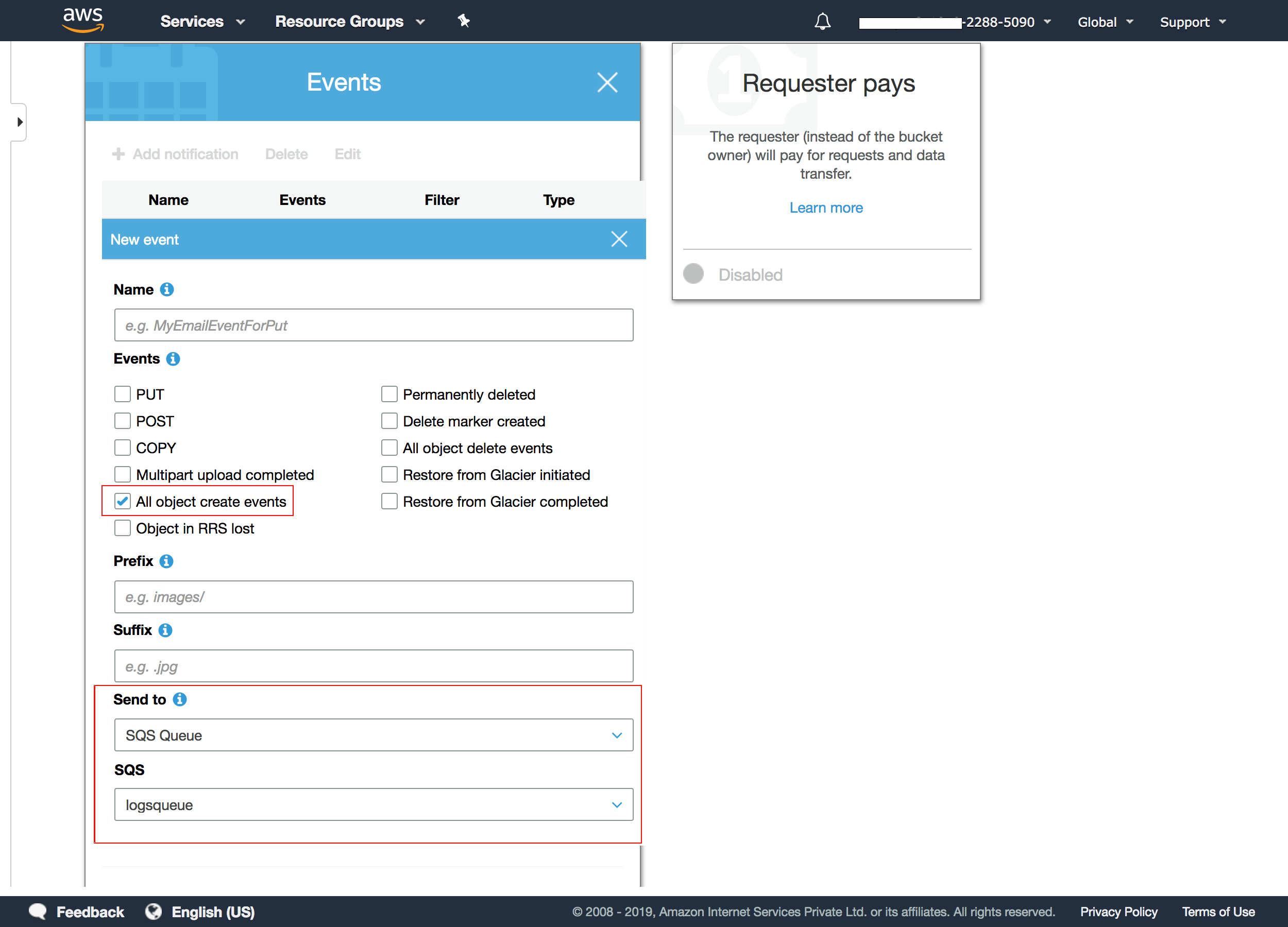 3. 单击高级设置下的事件选项卡,选择添加通知,然后选择字段所有对象创建事件。您还需要在“发送到”部分下选择 SQS 队列,并选择要将事件发送到的 SQS 队列的名称。