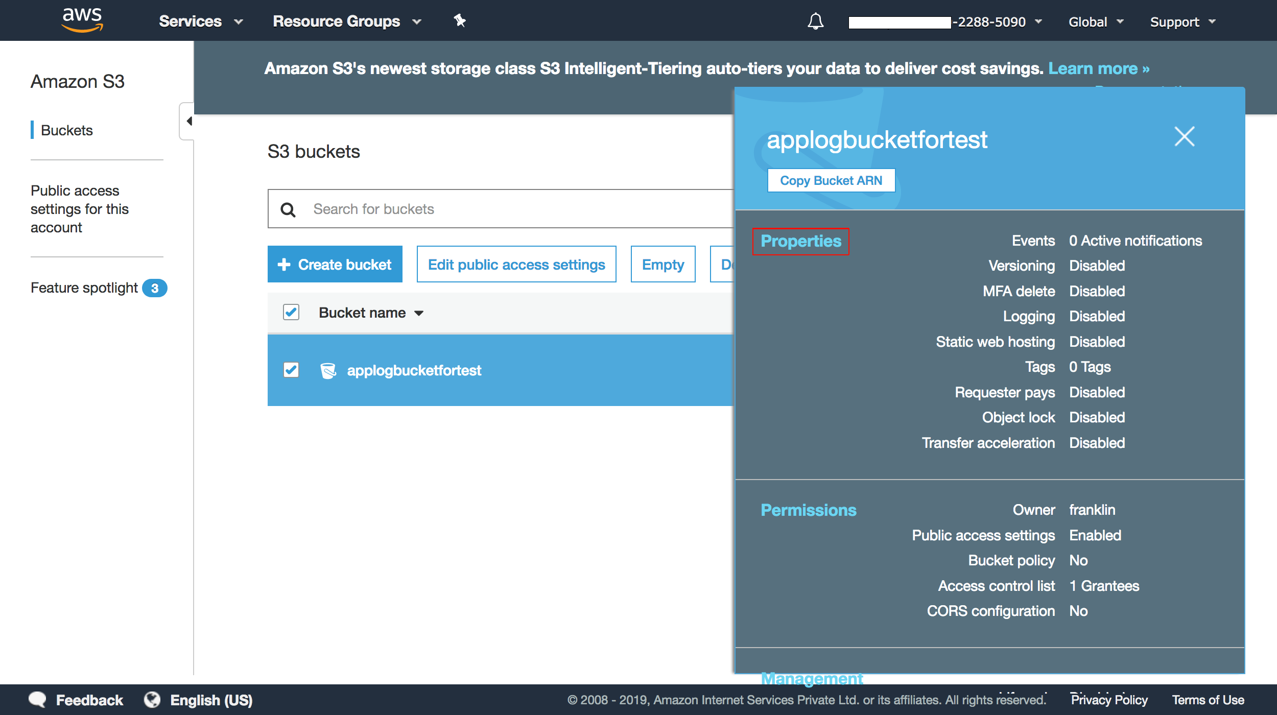 2. 择您放入 SQS 策略的存储桶,然后选择Properties选项卡。
