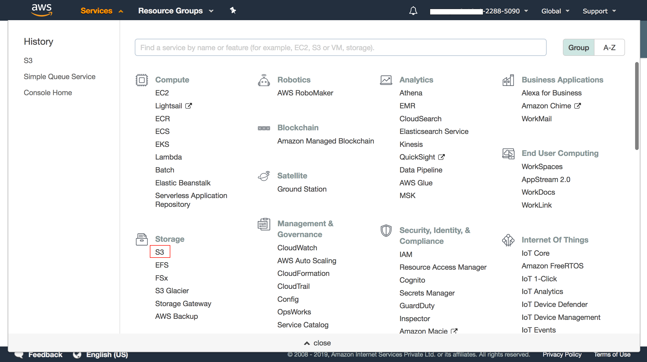 1. 从 AWS 控制台的服务下拉列表中选择 S3 。