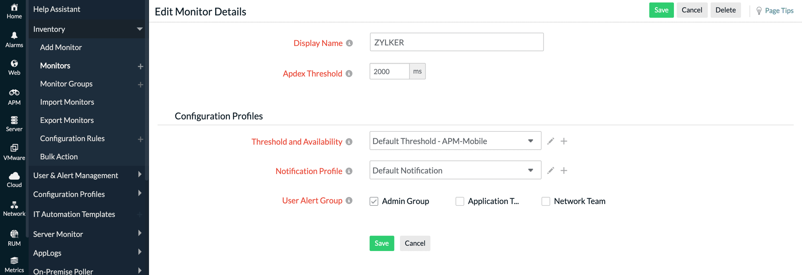 注意:您可以为 移动APM 的平均响应时间和 Apdex 值设置阈值限制。根据配置的值,您将在监视器进入故障或危急状态时收到告警。