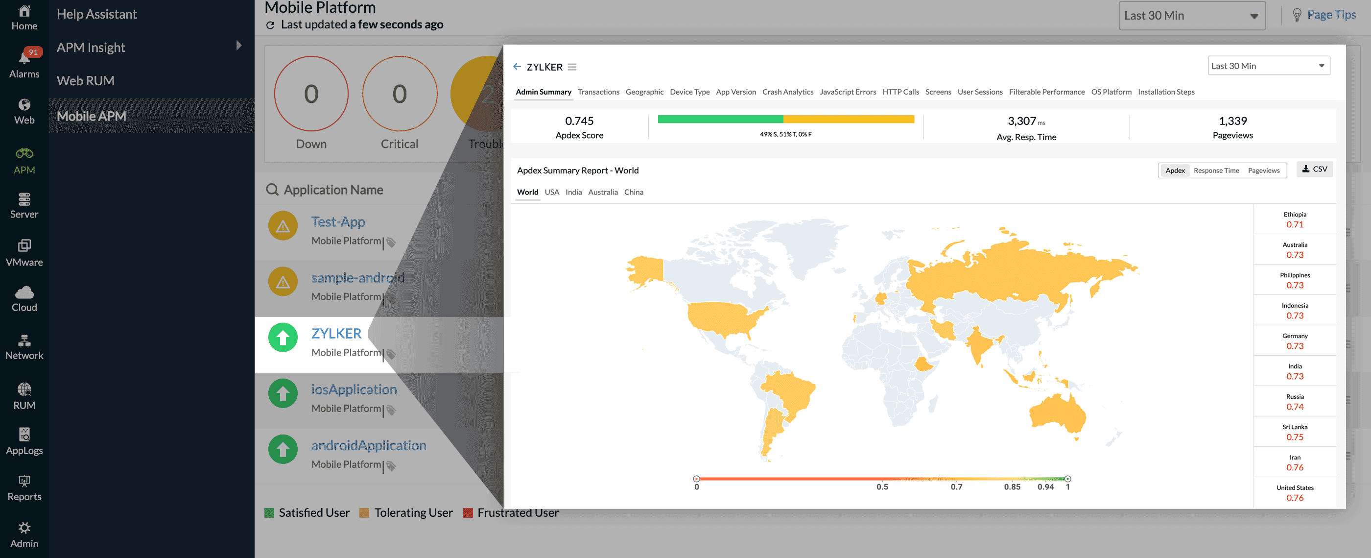 - 导航到Site24x7 APM Insight > 移动APM并单击您的移动应用程序。