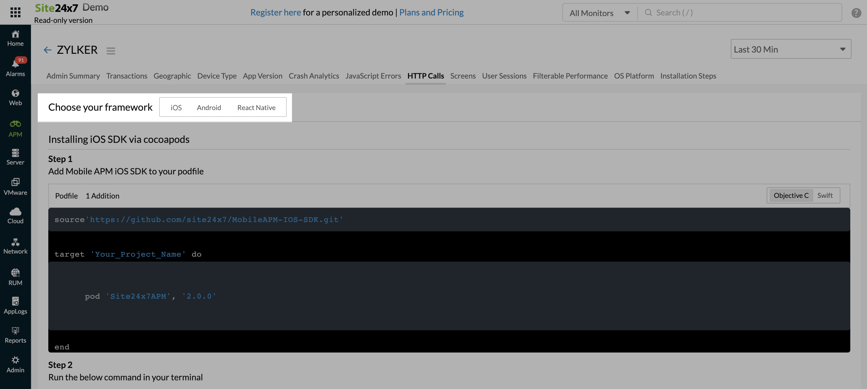 默认情况下,您将被重定向到 移动APM 监控页面。选择您的应用程序平台——iOS、Android 或 React Native——并按照安装步骤进行操作。