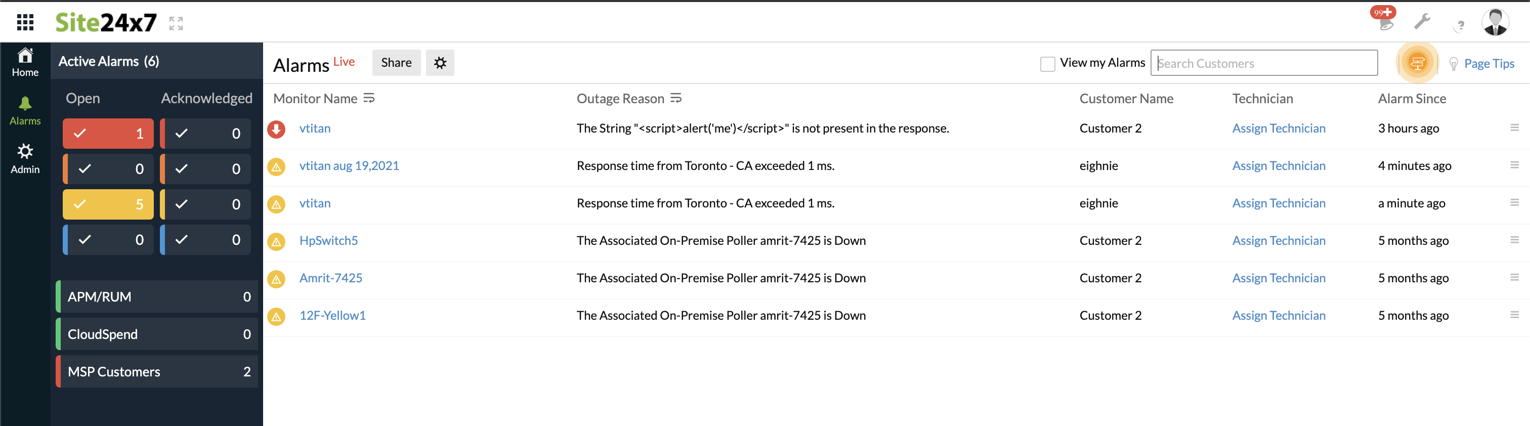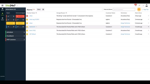 Site24x7 的 MSP 控制面板有一个内置的告警查看控制器来管理您客户帐户中的所有监控告警。它允许您通过按监视器名称和严重性对所有告警进行分组来关注客户帐户中的所有监视器问题。但是,MSP 将只能看到来自与其关联的那些客户帐户的监控告警。告警列表显示当前处于停机/故障/配置错误状态的所有监视器。此处未列出处于任何其他状态的监视器。如果问题自动解决或监视器从您的列表中删除 - 监视器状态将在监视器详细信息页面内呈现为 UP ,直到下一次轮询,告警将从告警列表中删除。告警仪表板中列出的各个告警将具有指向其相应告警特定详细信息页面的链接,其中信息分为告警摘要、中断历史记录、清单、日志报表和监视器的告警日志。基于严重性级别的告警分类可帮助您确定需要给予最高优先级并应首先解决的告警。此外,您可以根据需要将告警分配给任何技术人员。手动过滤器使您能够提取特定监视器类别的停机和故障告警。除此之外,技术人员还可以根据告警确认状态对告警进行过滤。