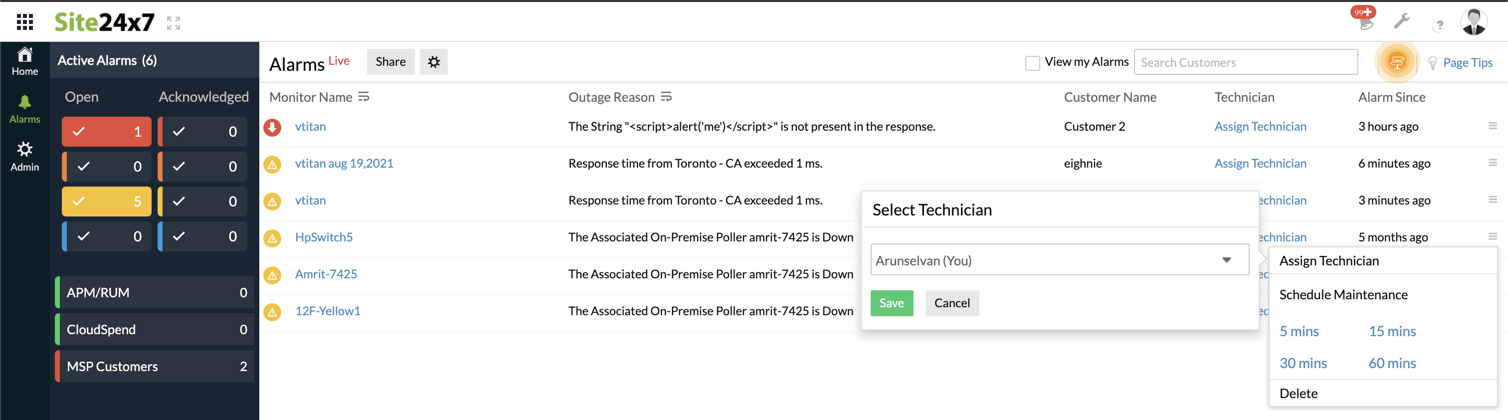 - 稍后,您可以单击取消选择此告警以从列表中删除此告警,并通过从选择技术人员下拉列表中选择用户将其重新委派给其他技术人员。