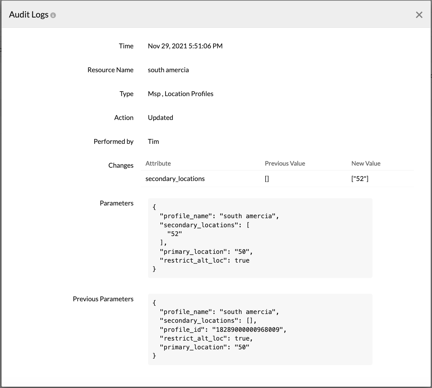 - 单击首选项行后,将打开一个新的审核日志弹出窗口,其中包含以下详细信息: