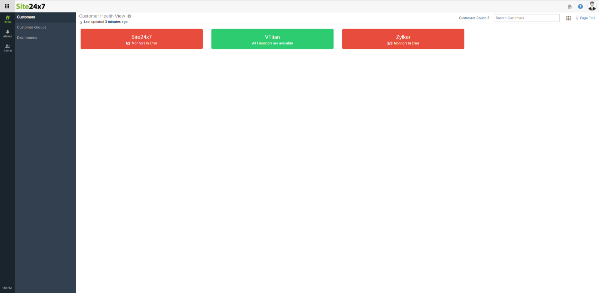 - 如果客户帐户至少有一个停机监视器,状态卡将以红色呈现输出。
