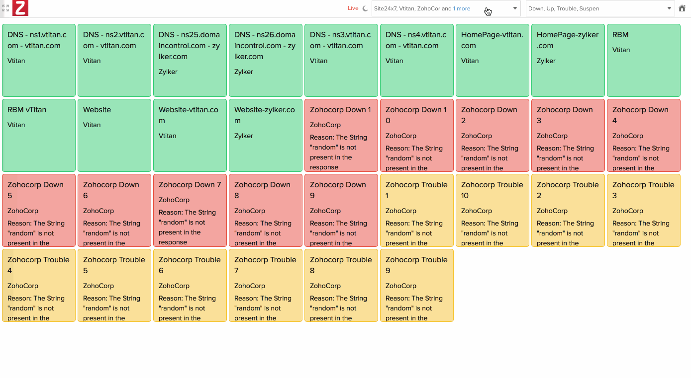 图标。在 NOC 视图中,您无需滚动即可在单个仪表板内查看 MSP 帐户中所有监视器的实时状态。各个监视器以方形图块表示,具有独特的颜色代码,显示其实时监视器状态以及相关监视器的名称和客户名称。使用 NOC 视图,您可以在单个屏幕中容纳多达 10K 的监视器。此外,对于停机或故障的监视器,还会显示中断原因。NOC仪表板已启用无点击功能。您还可以通过选择深色主题来更改您的 NOC 背景。