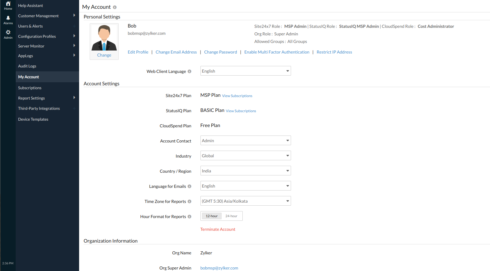 - 终止帐户:此选项可用于终止您的 Site24x7 MSP 帐户。