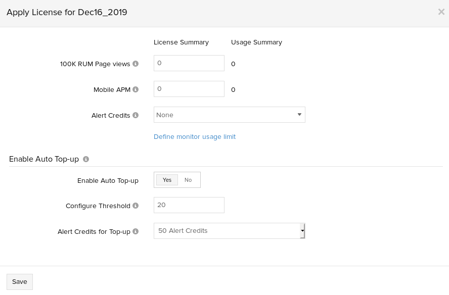 您可以稍后使用更新自动充值按钮更改设置的阈值和选择信用充值值或禁用告警充值选项。 MSP 管理员可以在应用许可部分