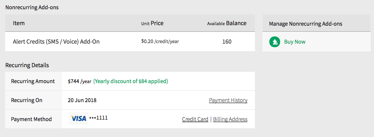 告警点数自动充值选项可用于接收不间断的短信/语音呼叫通知。此选项适用于信用卡和 pay pal 用户。要启用自动充值选项,请导航至 管理>订阅> 启用自动充值/更新自动充值。