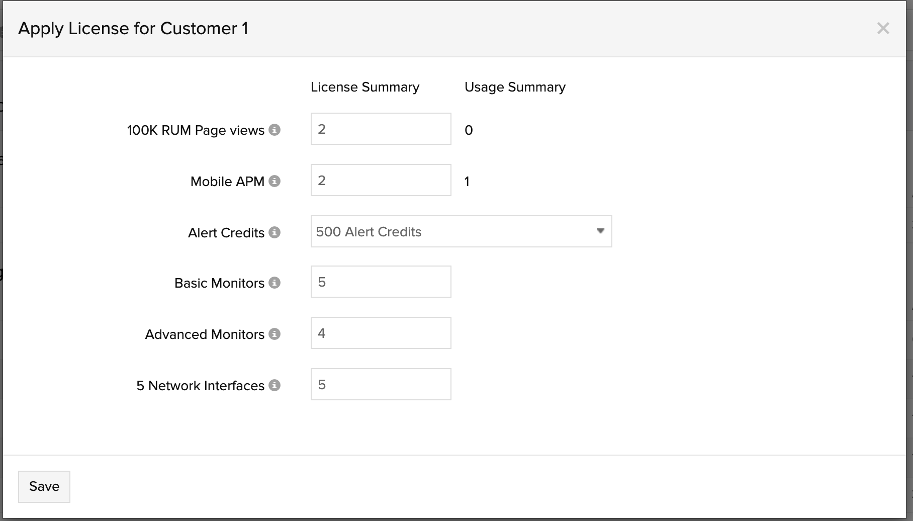 MSP 管理可以访问“应用许可”按钮以将 RUM 页面视图、AppLogs 和告警信用分配给各个客户帐户。
