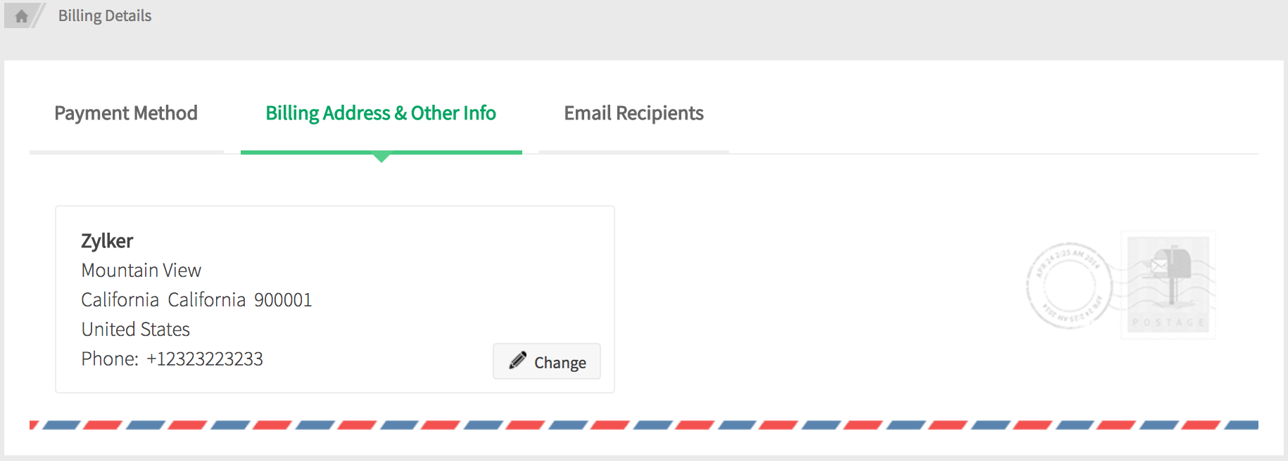 - 3.单击修改卡详细信息或账单详细信息。您现在将被重定向到 Zoho Stores 中的账单详细信息 窗口。