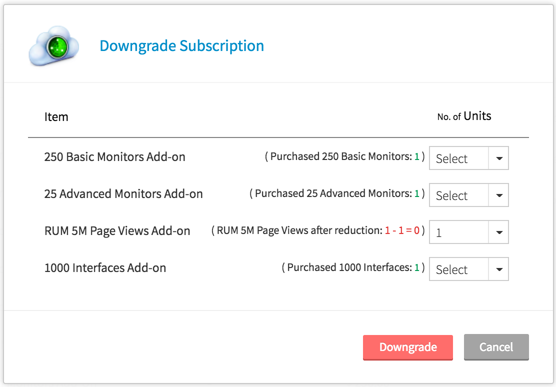 - 验证您的加载项计数并单击降级以降级您的监控加载项。