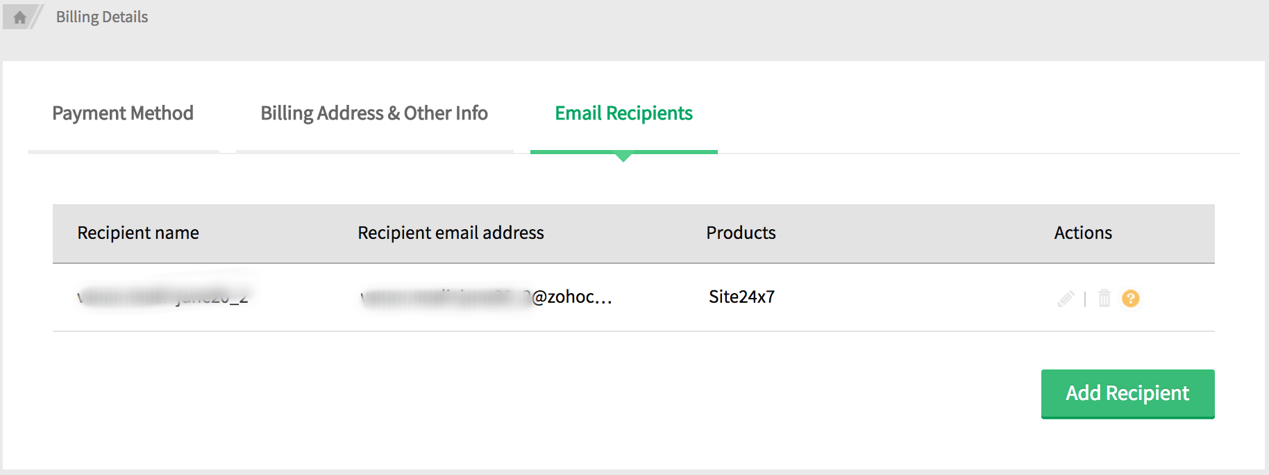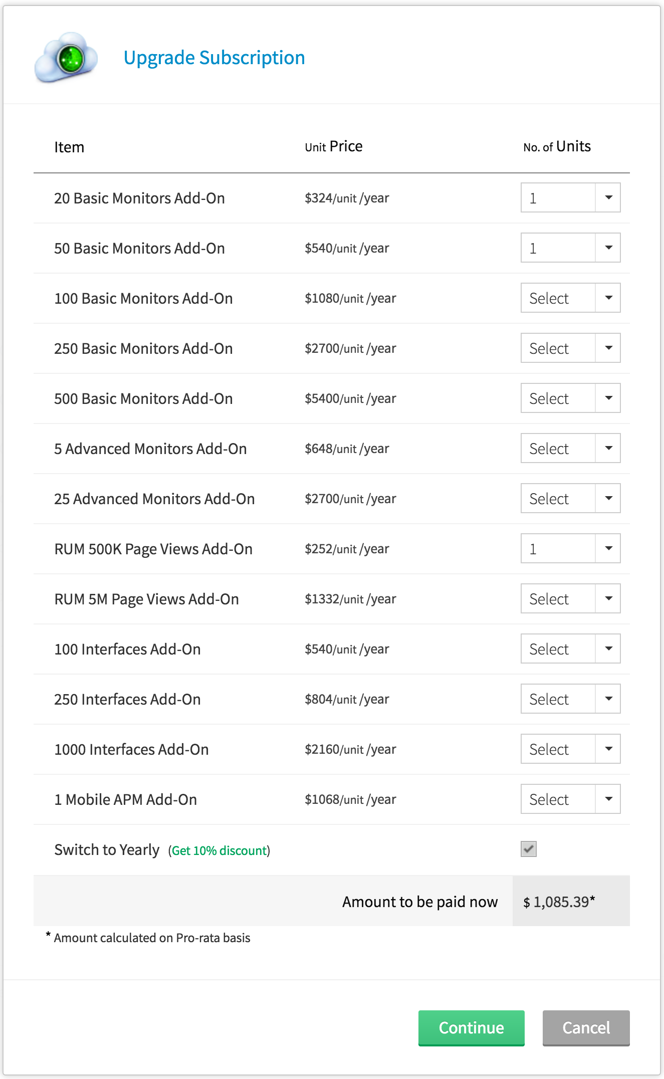 Site24x7 可让您将付款期限从每月更改为每年。一旦转为按年付款期限,您就不能再改回按月付款期限。我们不提供任何季度或半年付款期限。