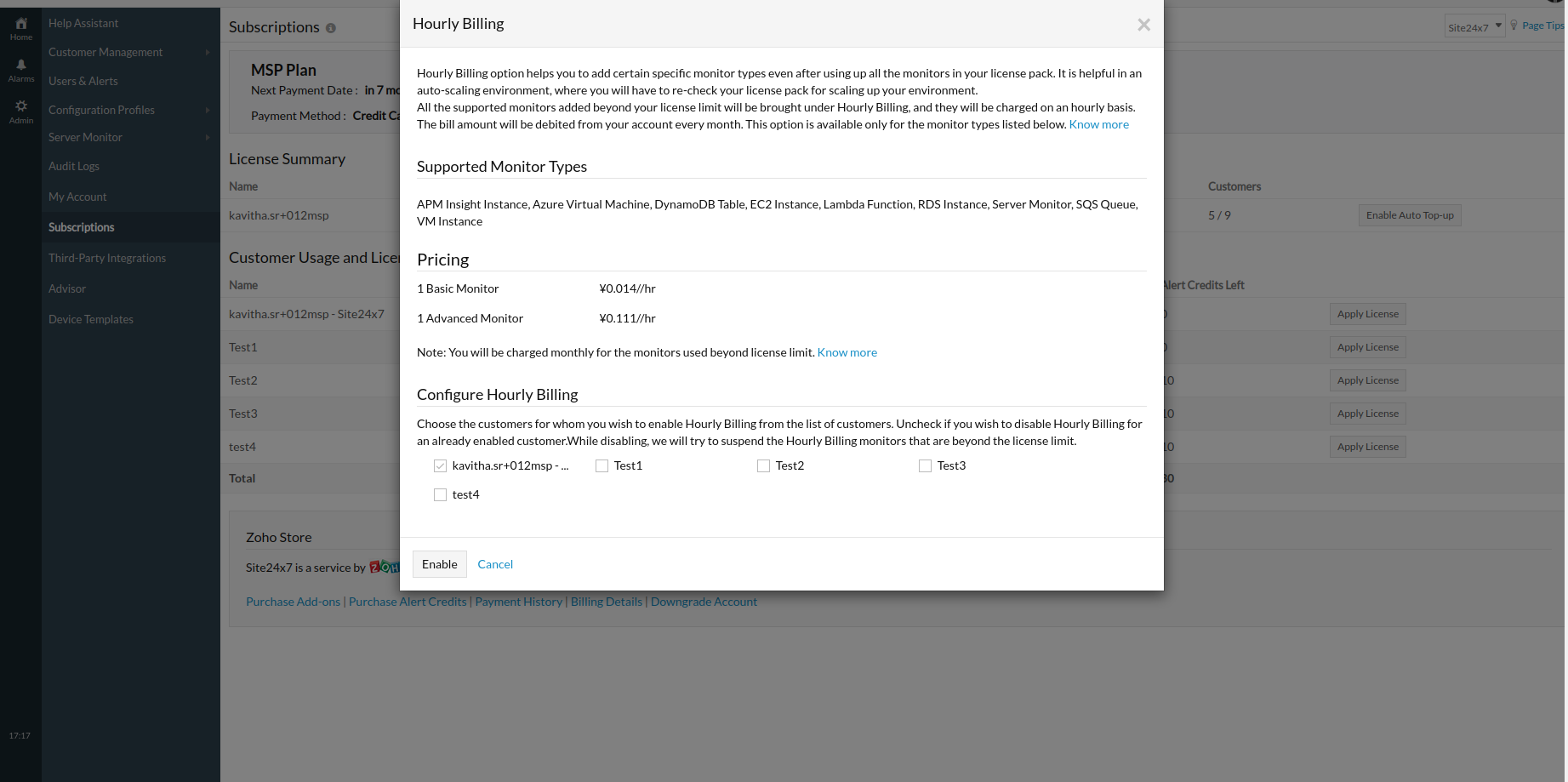 3. 单击小时价格选项旁边提供的配置小时价格选项,然后在打开的小时价格弹出窗口中单击启用按钮。将为选定的 MSP 客户启用按小时计费。