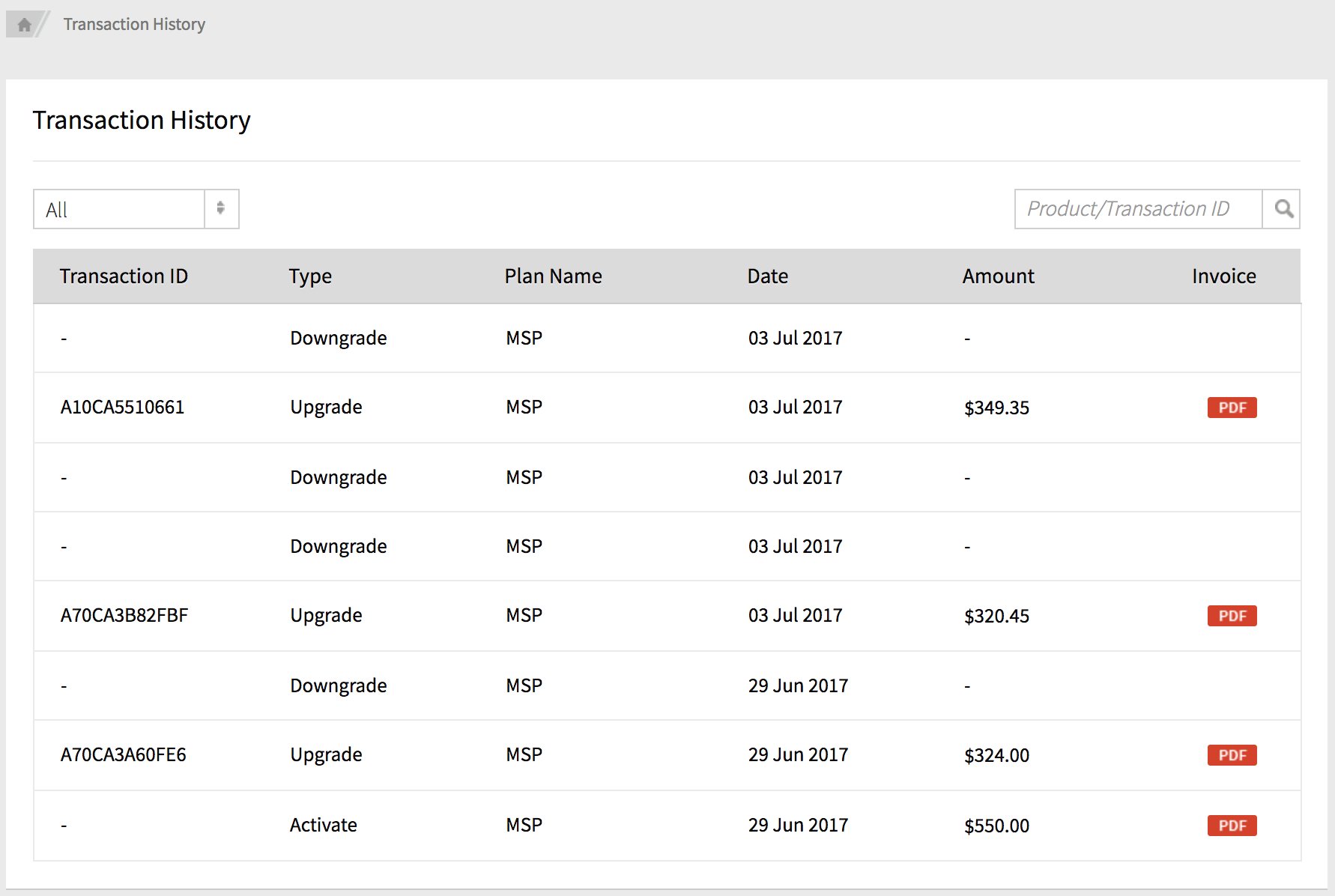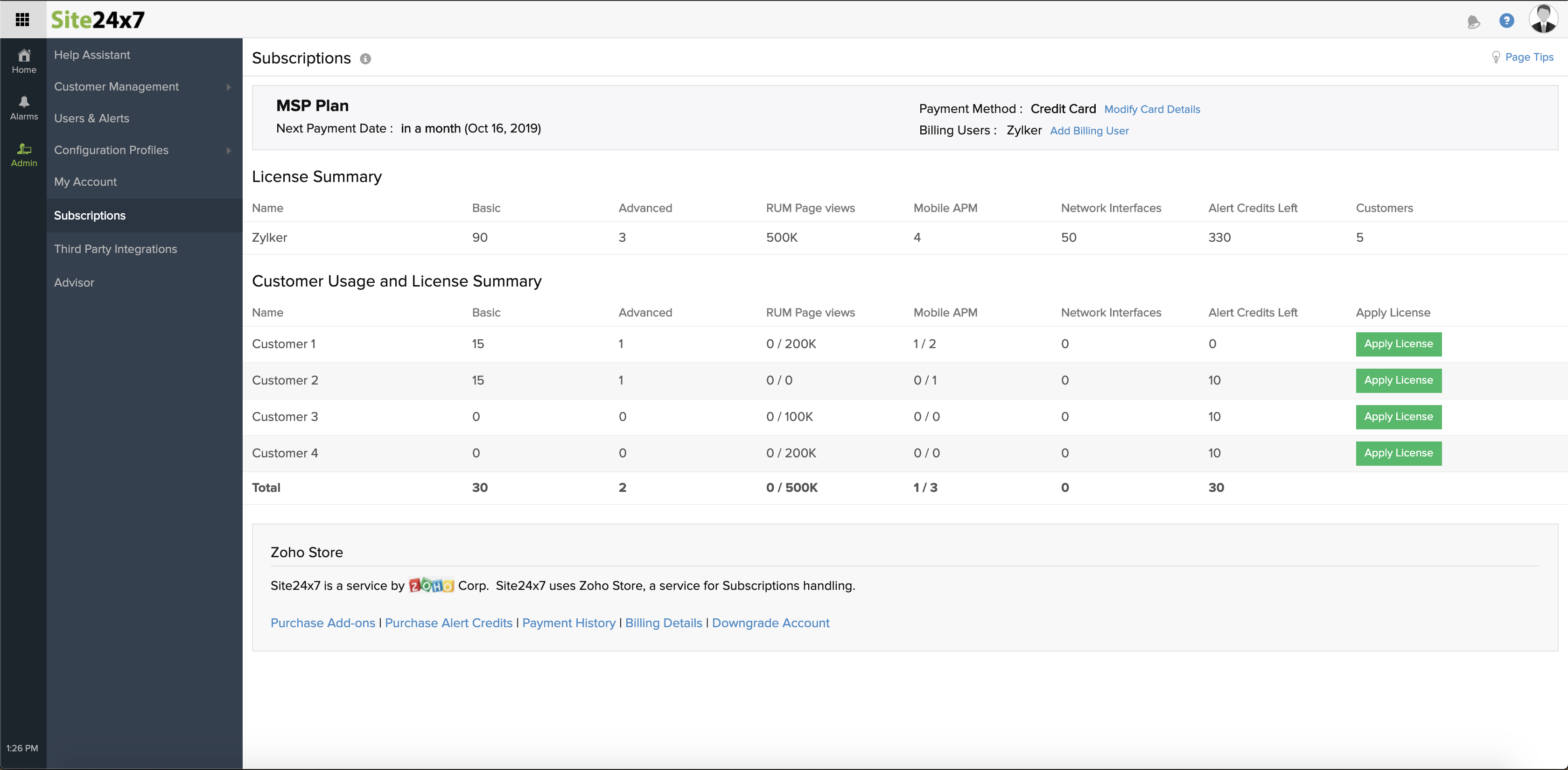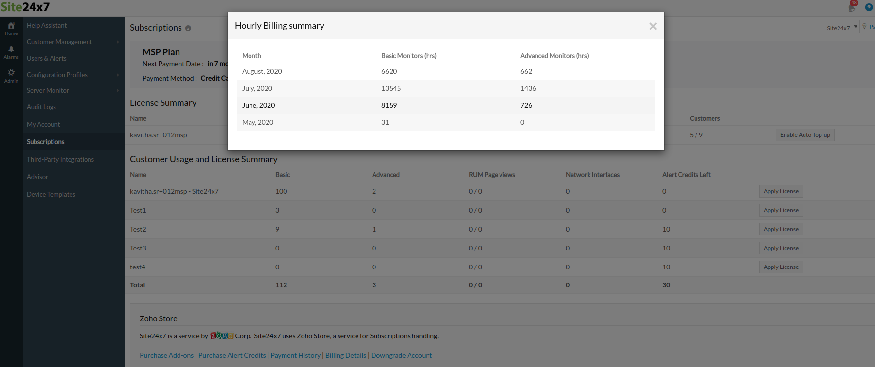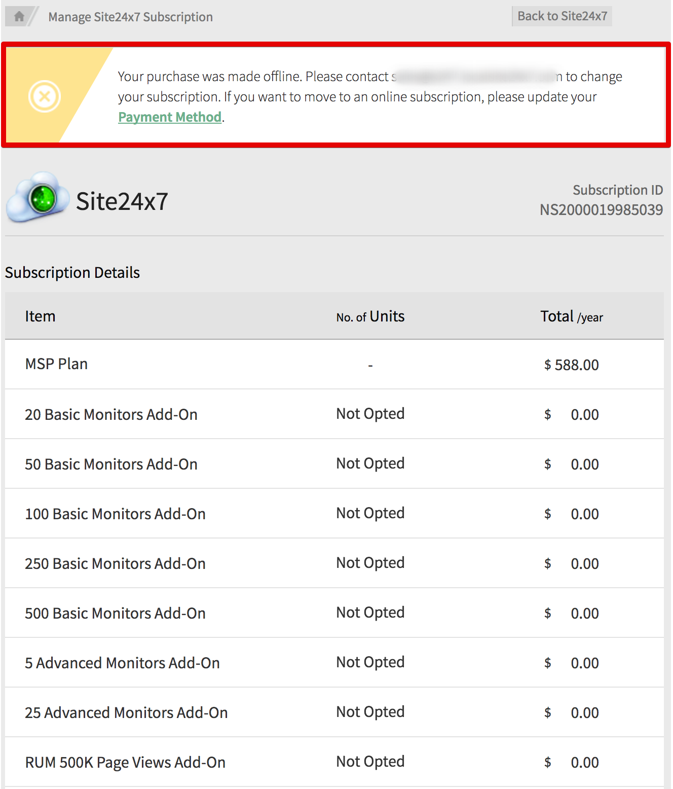 Site24x7 在您付款周期的下一个续订日期自动续订您的 MSP 订阅计划。这将适用于信用卡和PayPay付款方式。