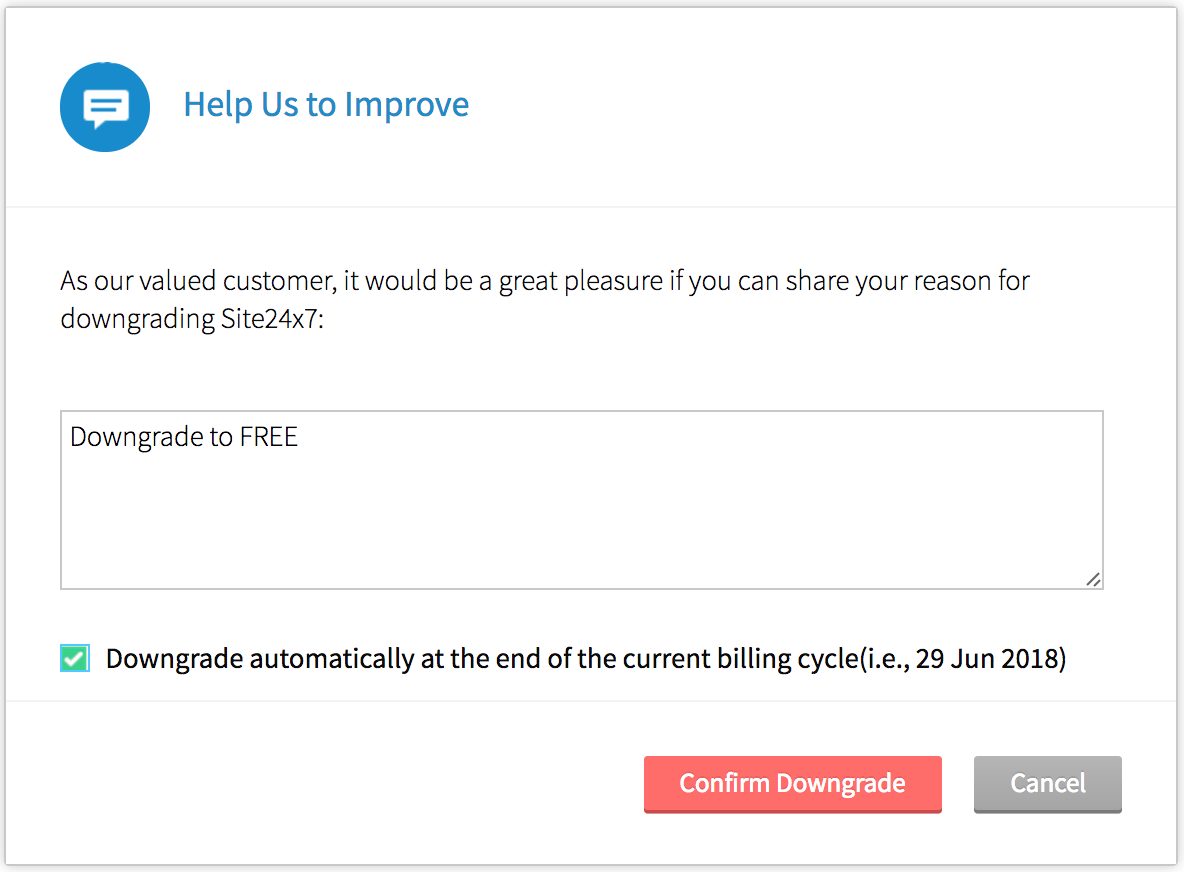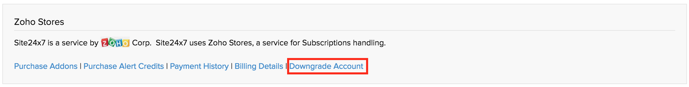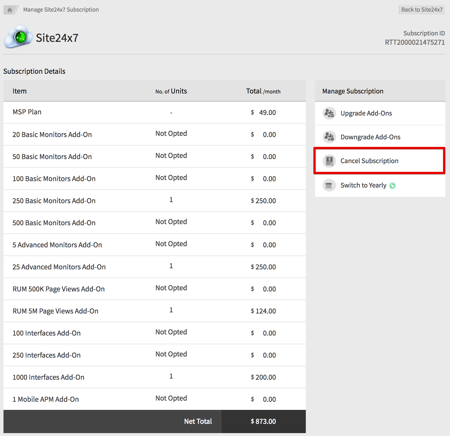 - 这会将您导航到“管理 Site24x7 订阅” 窗口。在这里您可以升级/降级您的插件。