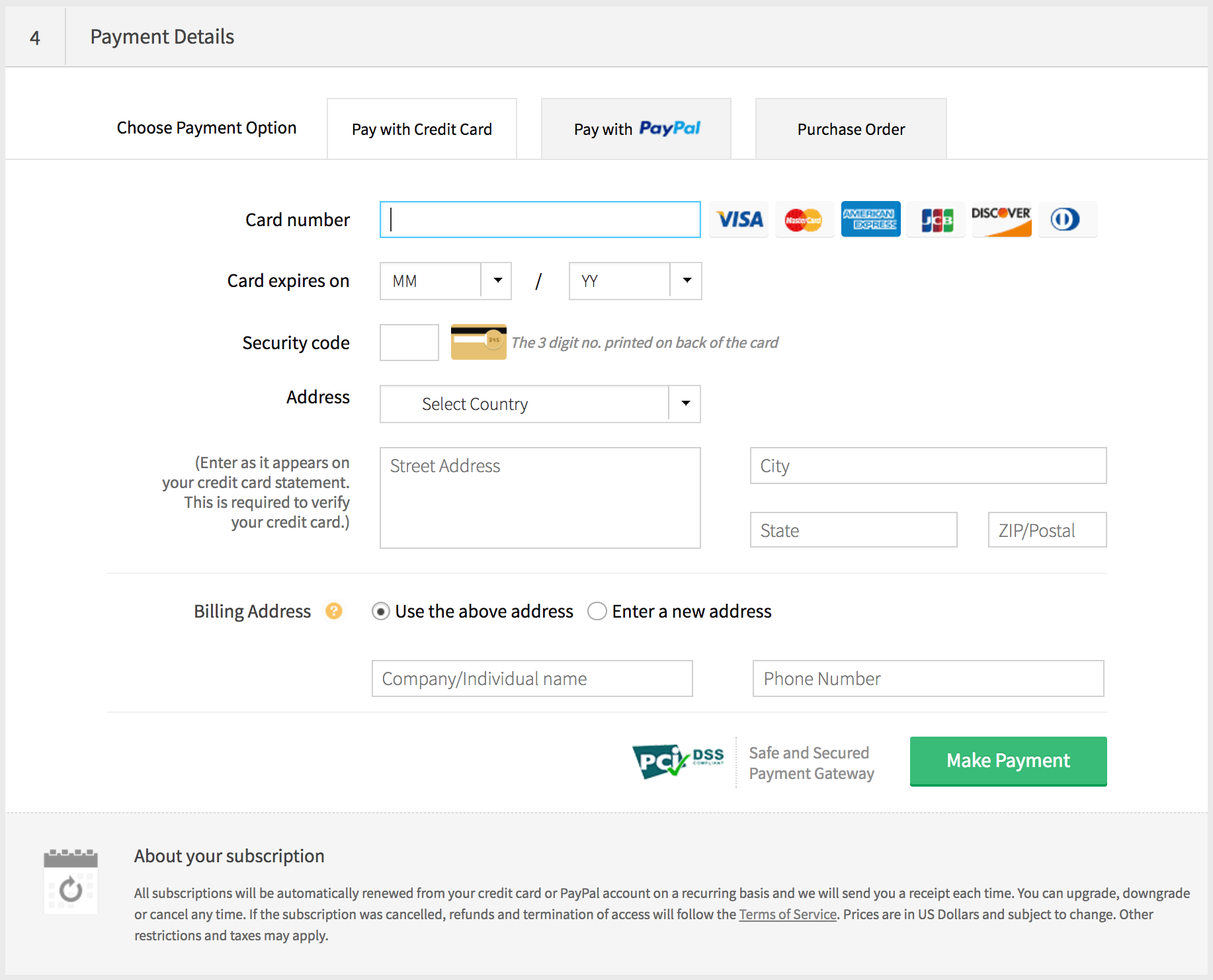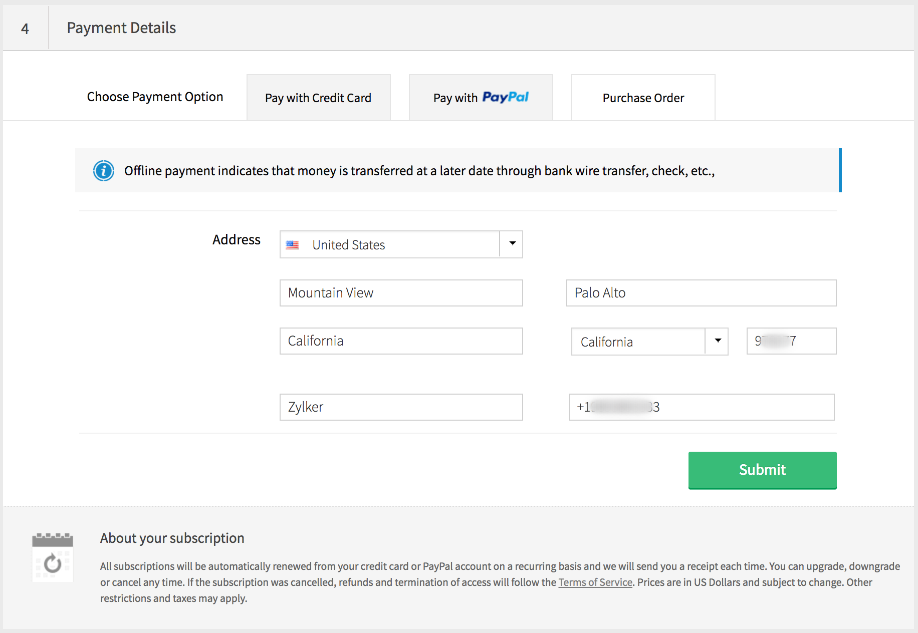 - 在订阅周期的任何时候,您都可以从离线 PO 事务转移到信用卡或 PayPal 等在线订阅模式。了解更多。