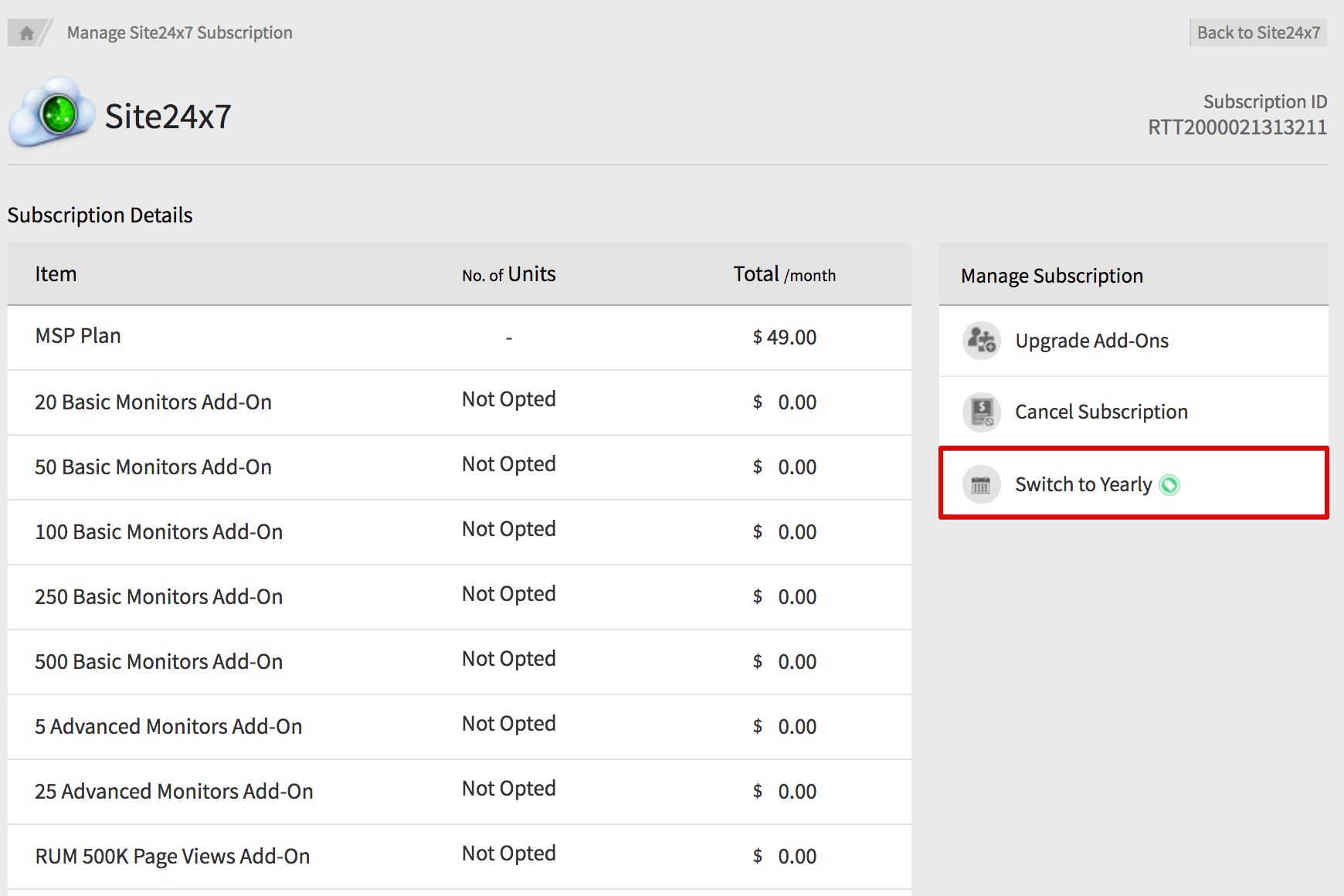 - 您将被路由到管理 Site24x7 订阅屏幕。在这里,单击管理非循环选件下列出的立即购买 。