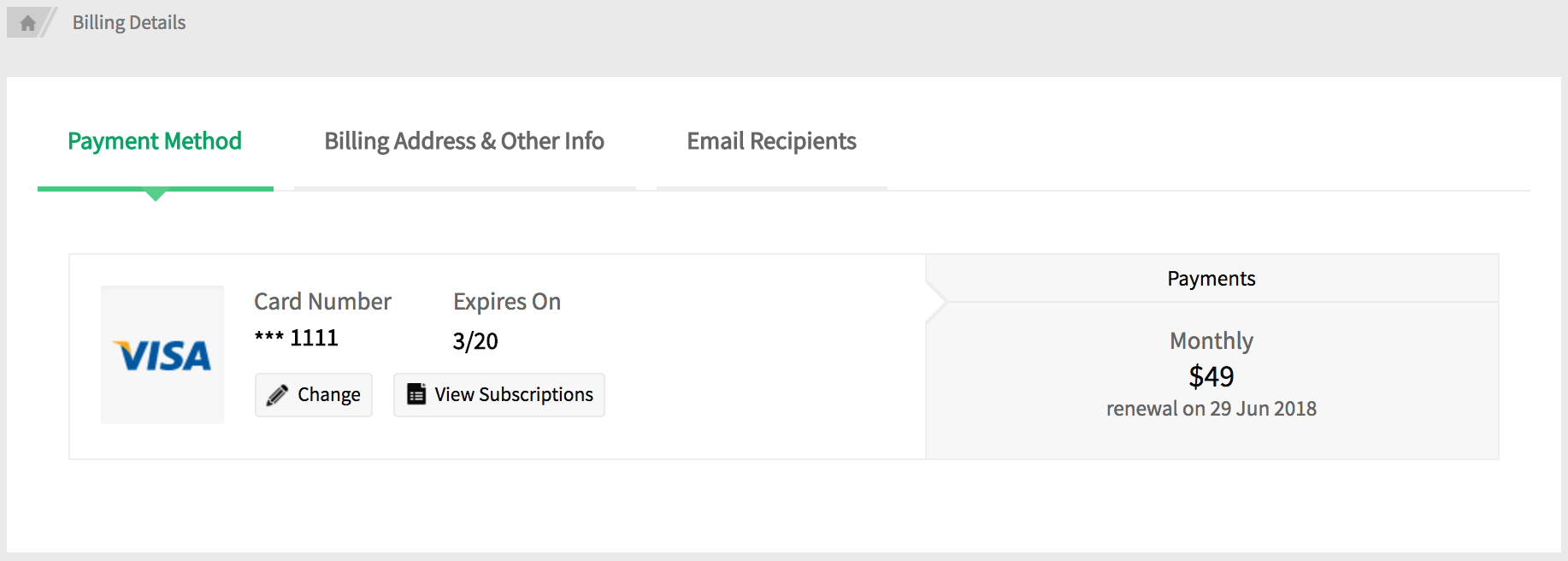 - 4.在付款方式选项卡下,单击更改图标。提供新卡的详细信息,然后单击更新。您还可以通过单击查看订阅按钮查看当前订阅计划。
