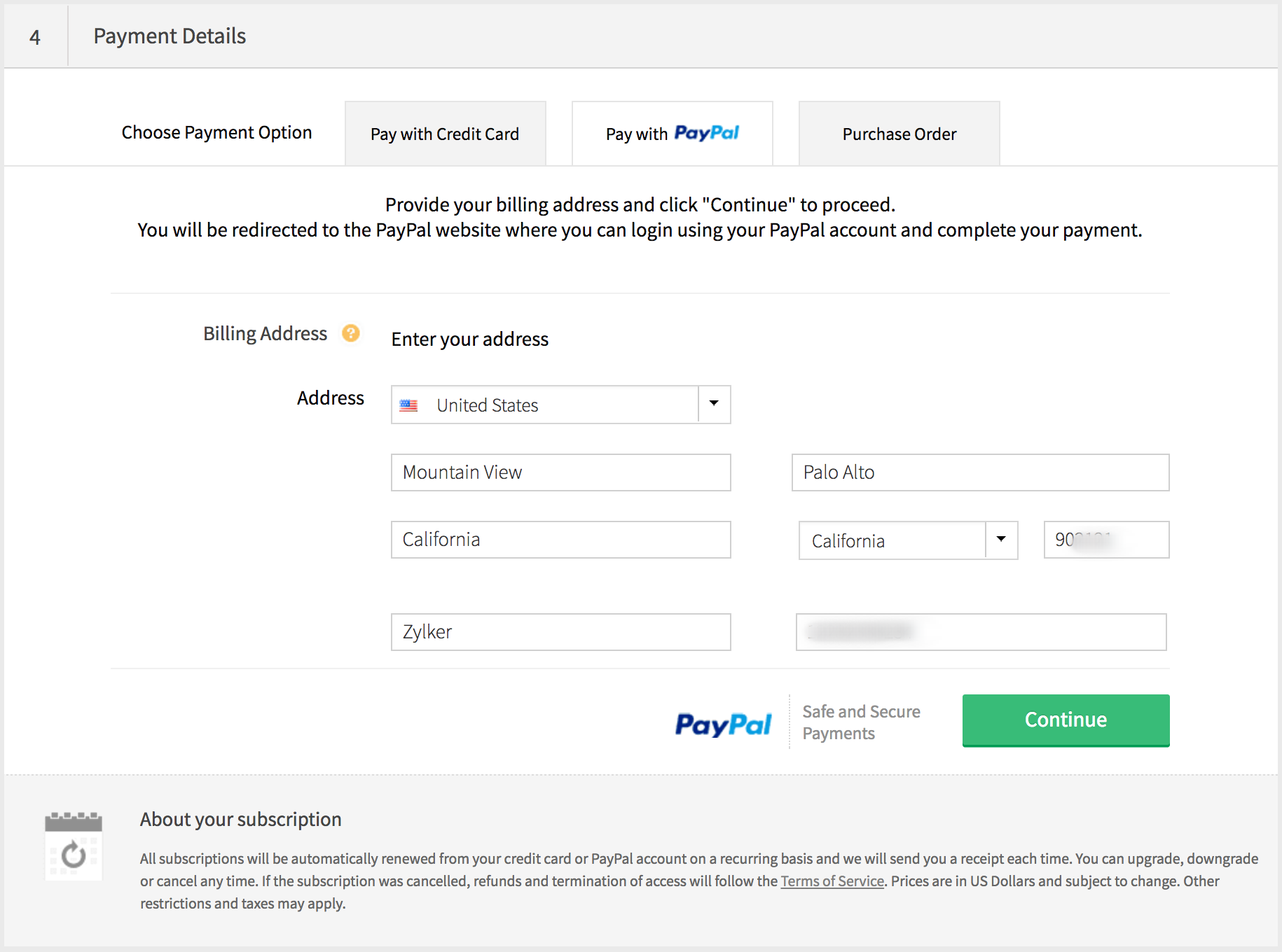 - 填写账单地址后,单击继续以启动 PayPal 事务。您将被重定向到 PayPal 网站,您可以在其中完成事务。
