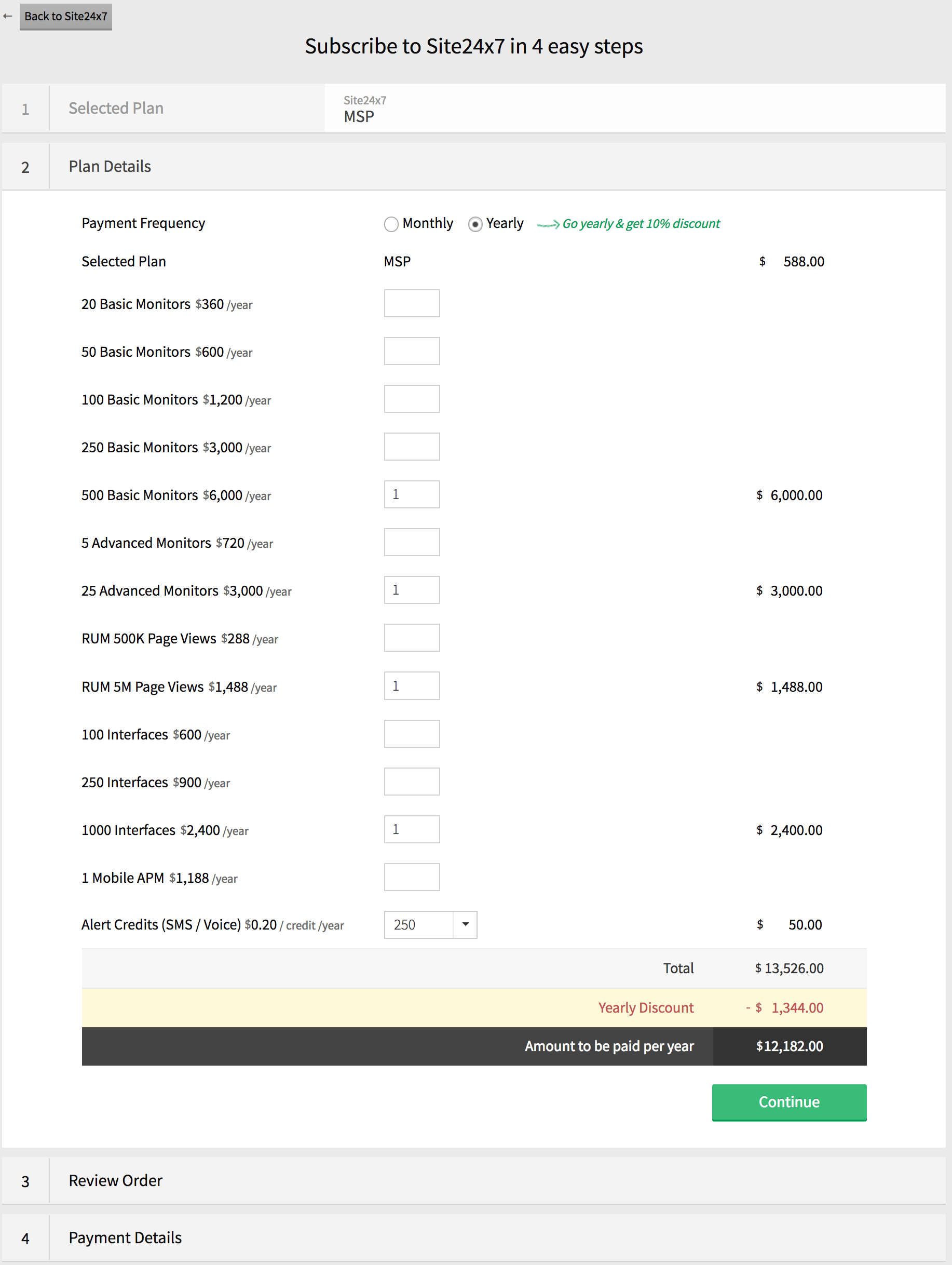 这将带您进入 Zoho Store 下的 Site24x7 MSP 计划列表页面(由 Site24x7 用于订阅处理。)