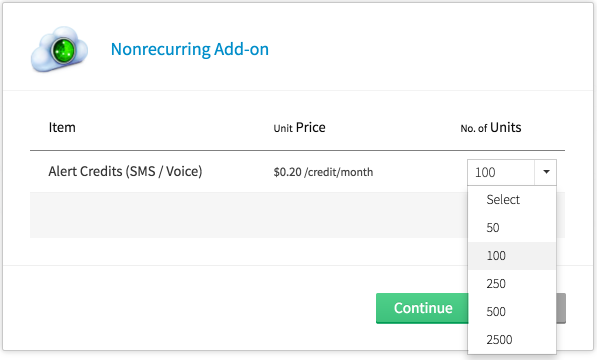 美国境外 1 语音提醒 = 2 点数 - 验证您的告警信用计数,然后单击继续 购买额外的告警信用。