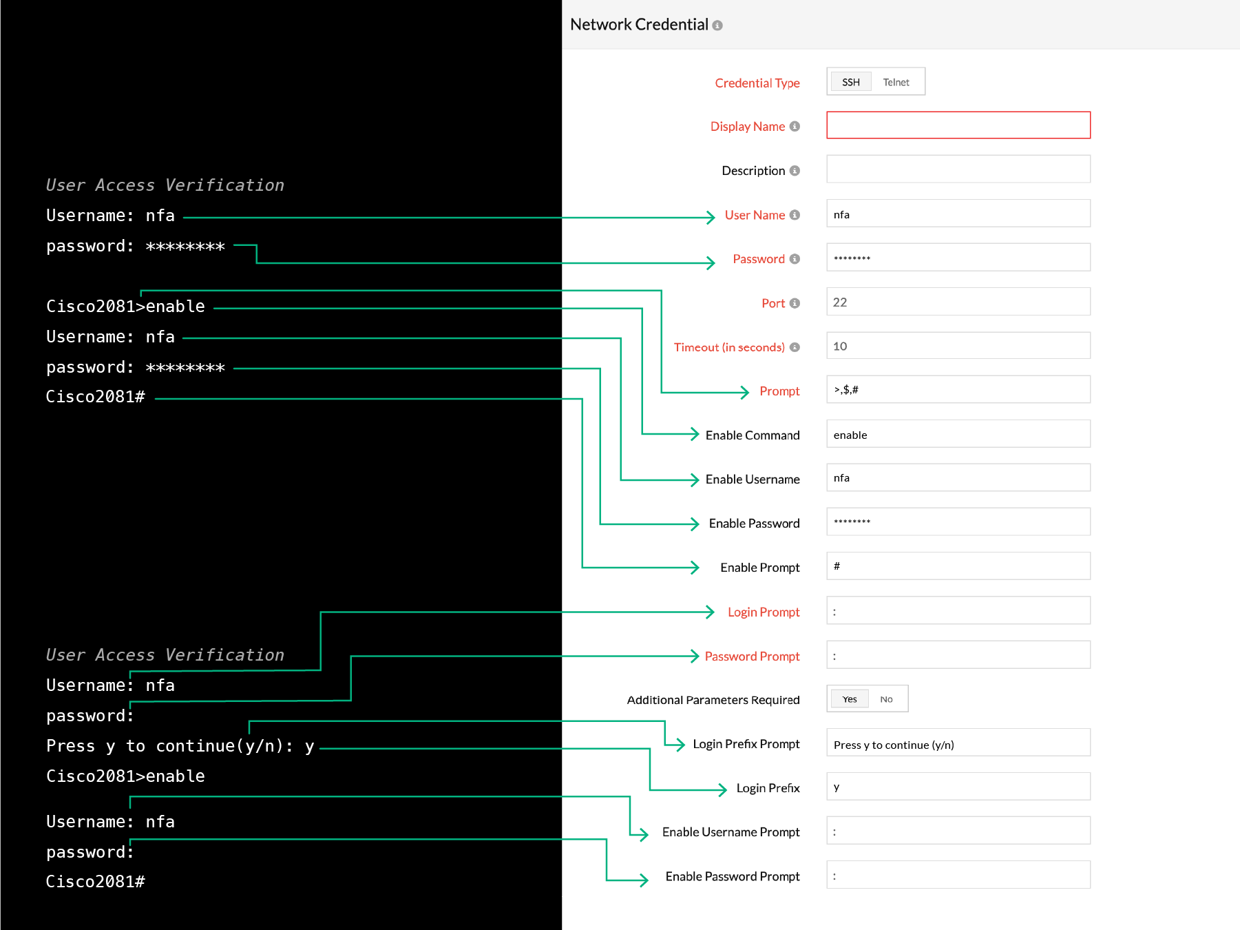 - 如果需要附加参数,则切换为是并输入它们。通过参考下面的屏幕截图,为您各自的凭证输入登录前缀提示、登录前缀、启用用户名提示和启用密码提示。