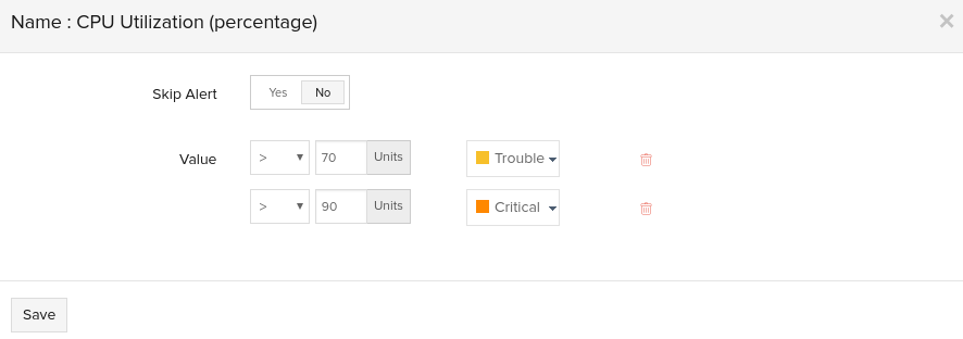 - 在弹出窗口中填写以下字段。您可以将条件设置为“严重”或“故障” ,根据这些条件您将收到有关这些阈值的告警。